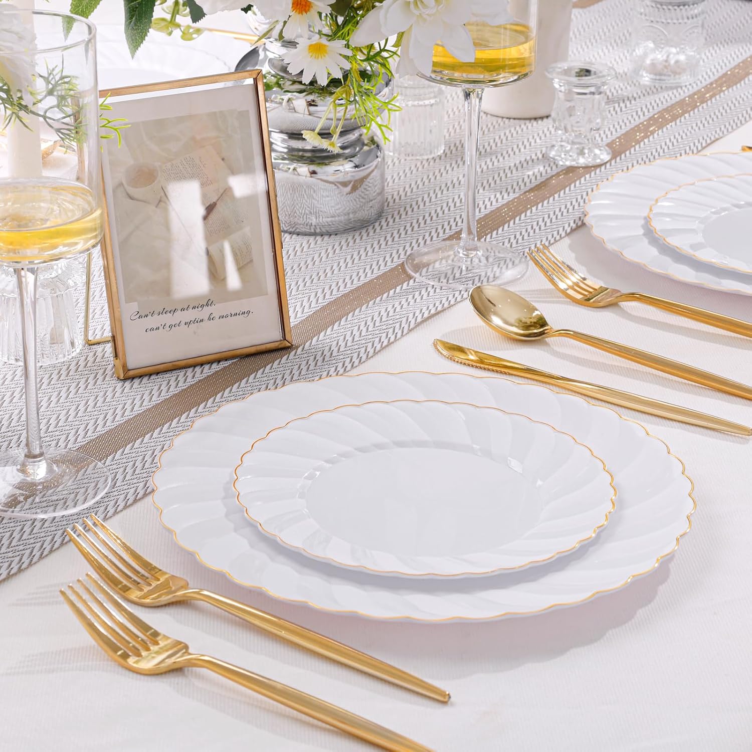 - Fancy scalloped design: This white plastic plate is different from the monotony of ordinary ones. It features scalloped edges combined with exquisite gold edges to enhance the sense of elegance. It combines the soft curves with the luxurious glow of golden decorations, presenting a simple and refined style. It can also be adapted to various scenarios, making meals more appetizing and tablecloths more exquisite. Moreover, the gold edge is made with durable and wear-resistant technology, which is not easy to peel off or fade after hand washing.