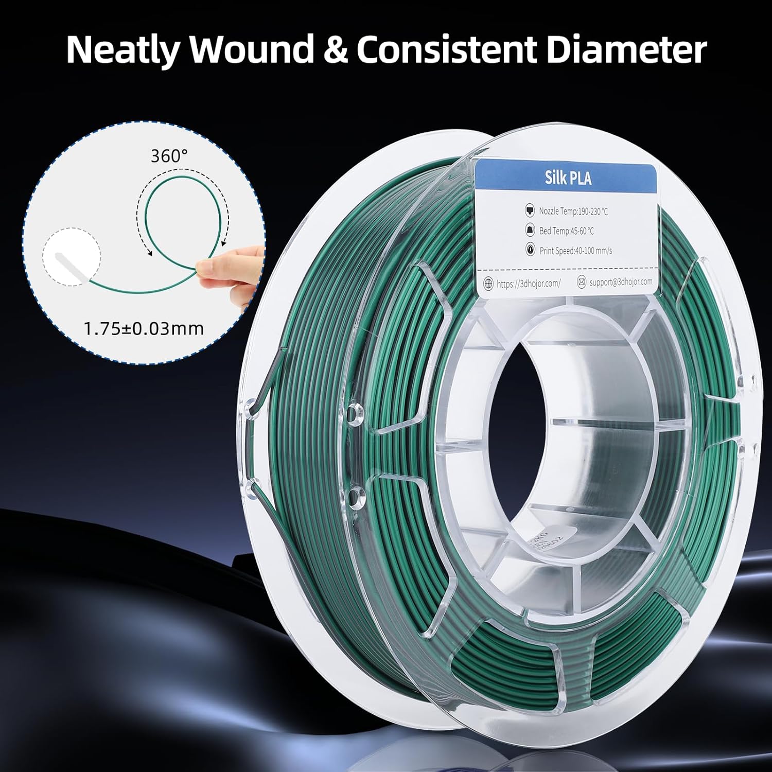 - Easy to print: The diameter of 3DHoJor silk filament is 1.75mm +/- 0.03mm. Precise wire diameter ensures continuous and stable feeding without clogging. It has perfect first layer adhesion to reduce warpage, shrinkage and print failure. Good shaping, strong toughness, no bubble, no warping, melt well, perfect for beginner or expert.