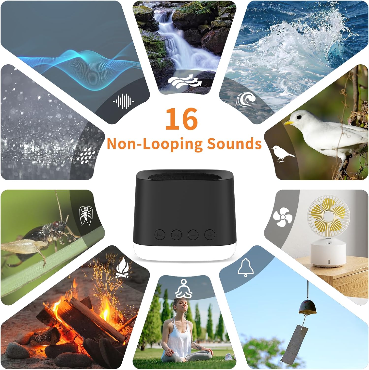 - 【16 Sound Options & 20 Volume Control】: The sound machine for sleeping adults variety of non-looping sound options like white noise, pink noise,brown noise, fan sounds, rain, wind chimes and ocean waves,etc.Use sound samples that play continuously without repeating, preventing audible loops. 20 levels of adjustable volume allows tailoring the sound level to your preferences and environment. Essential for comfortable listening
