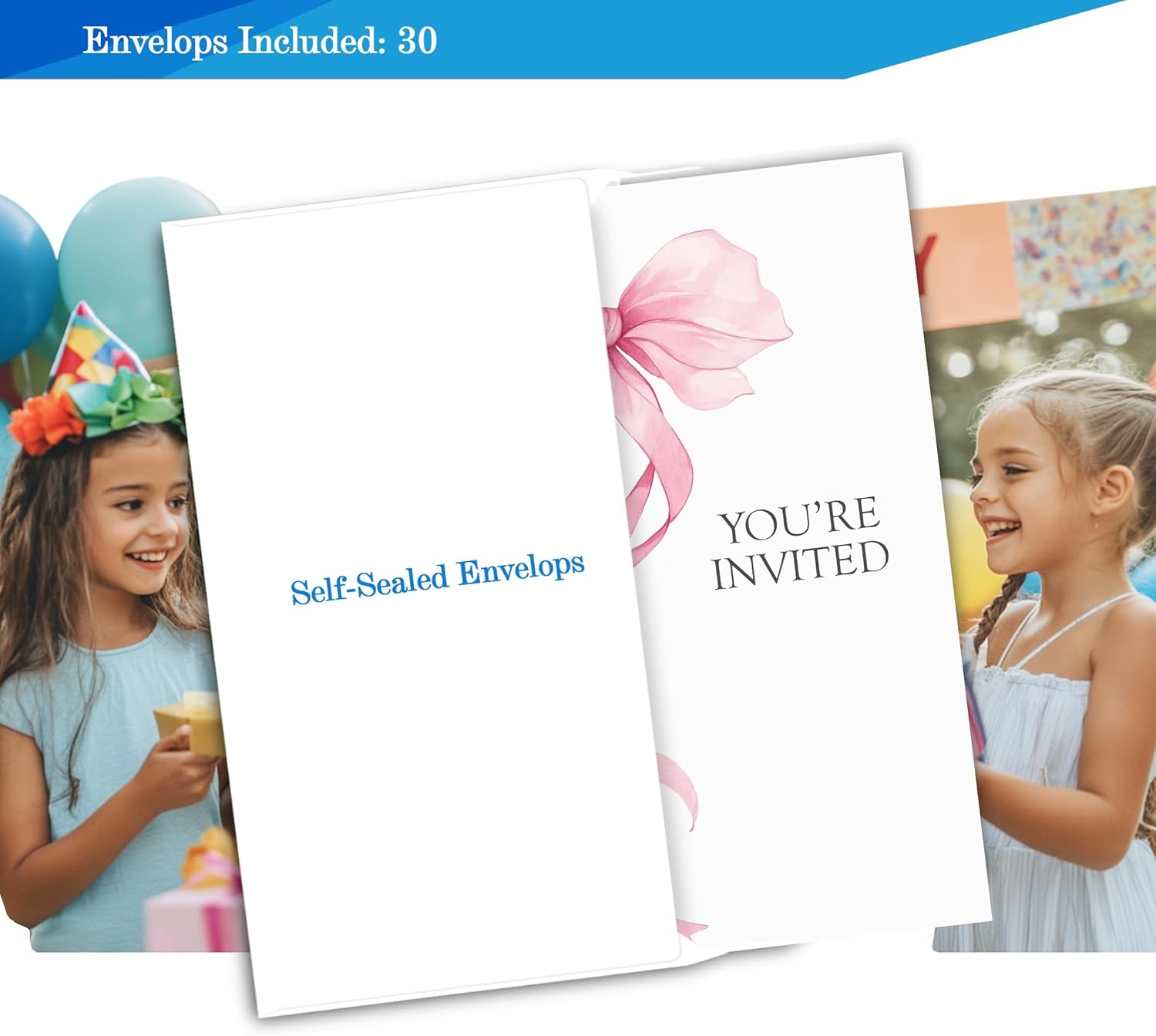 - What You Get - Each pack comes with 30 pack Pink Bow birthday party invitation cards and 30 pack white self-adhesive envelopes. The cards are 4" x 6", which is just right for all the information you need.