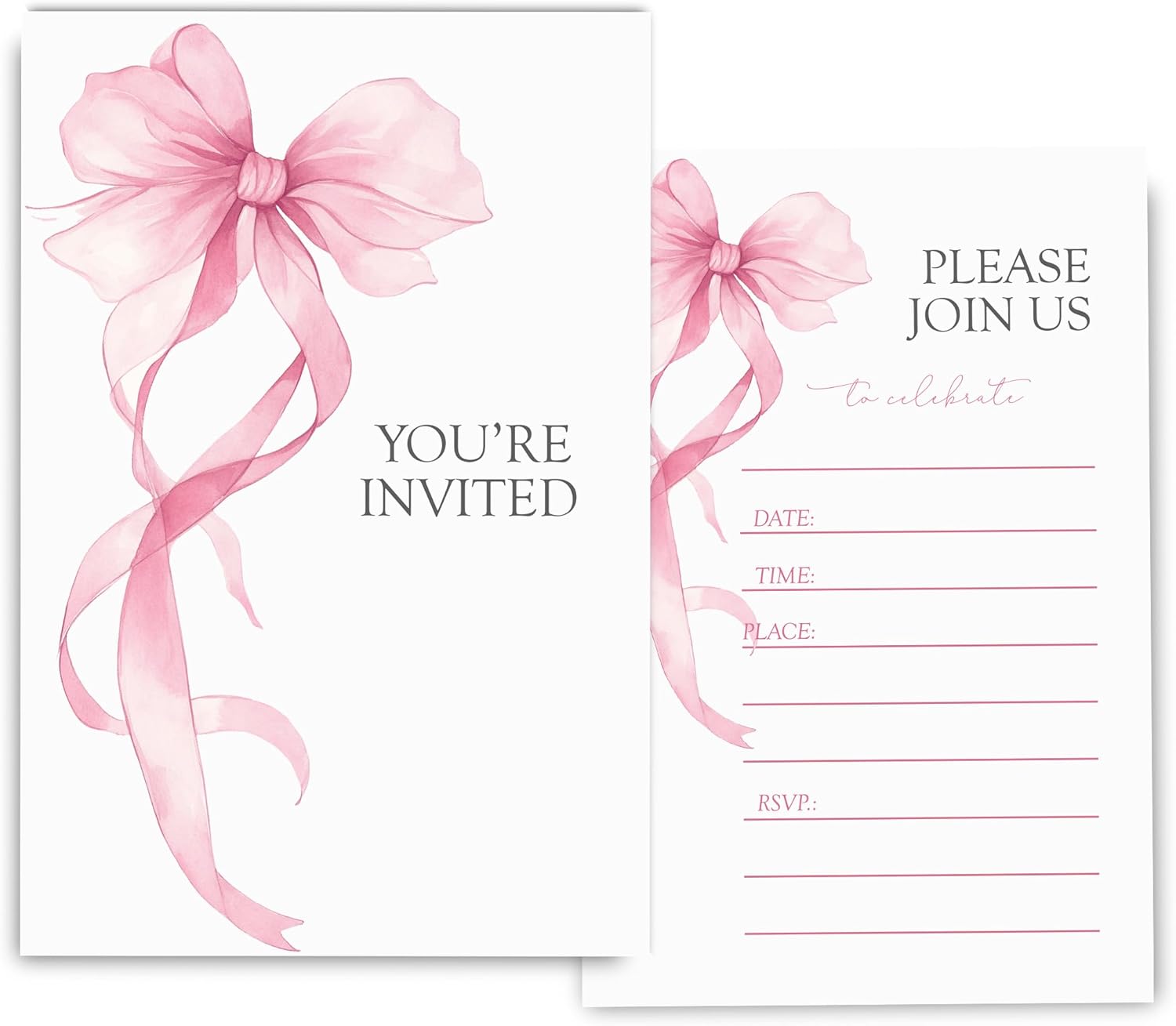 Pink Bow Birthday Invitations for Girls, Elegant Bow Birthday Party Invitaions for Girls Coquette Party Invites, 4x6 Inches, 30 Sets with Envelopes