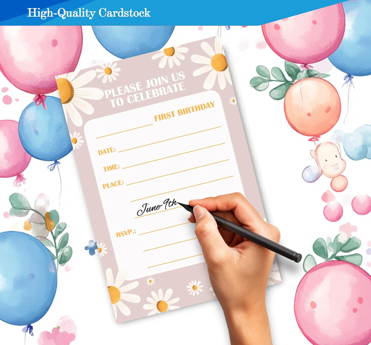 Daisy 1st Birthday Invitations for Girls, Daisy One Birthday Party Invitaions for Party Invites, 4x6 Inches, 30 Sets with Envelopes
