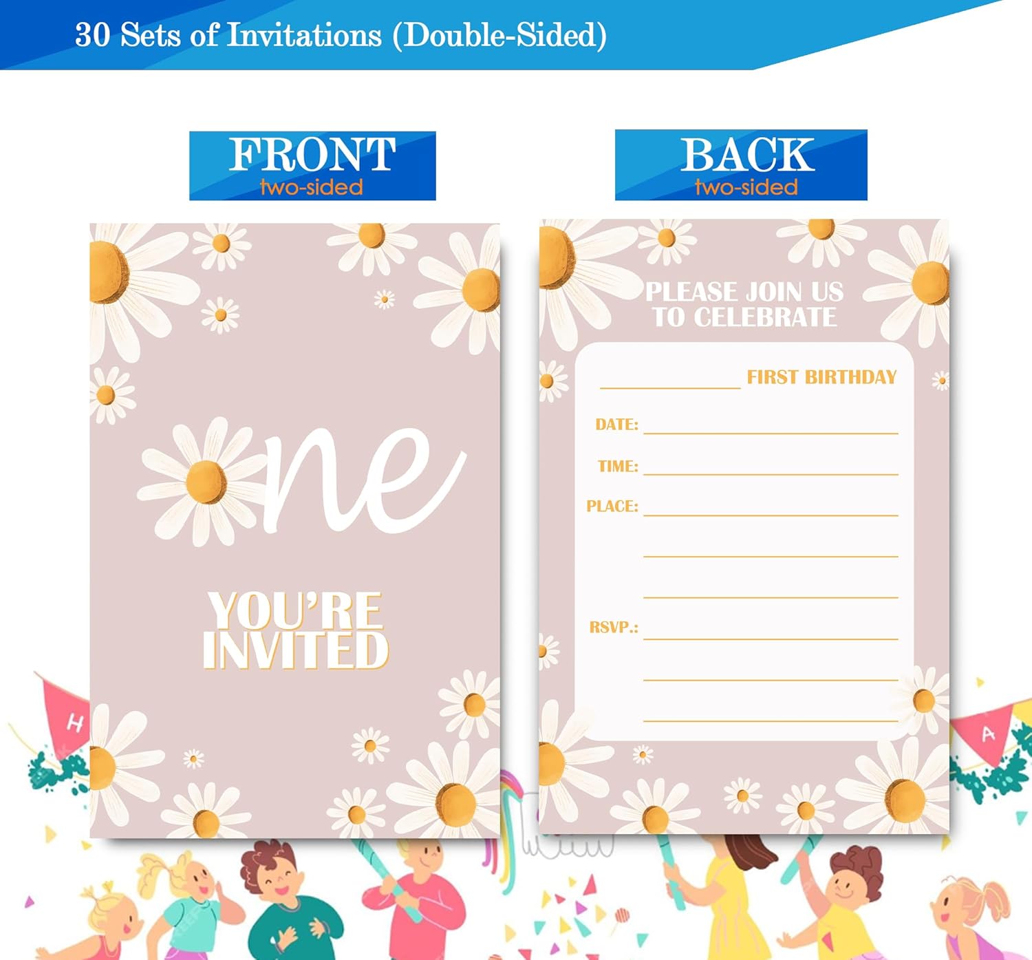 - What You Get - Each pack comes with 30 pack Daisy 1st birthday party invitation cards and 30 white self-adhesive envelopes. The cards are 4" x 6", which is just right for all the information you need.