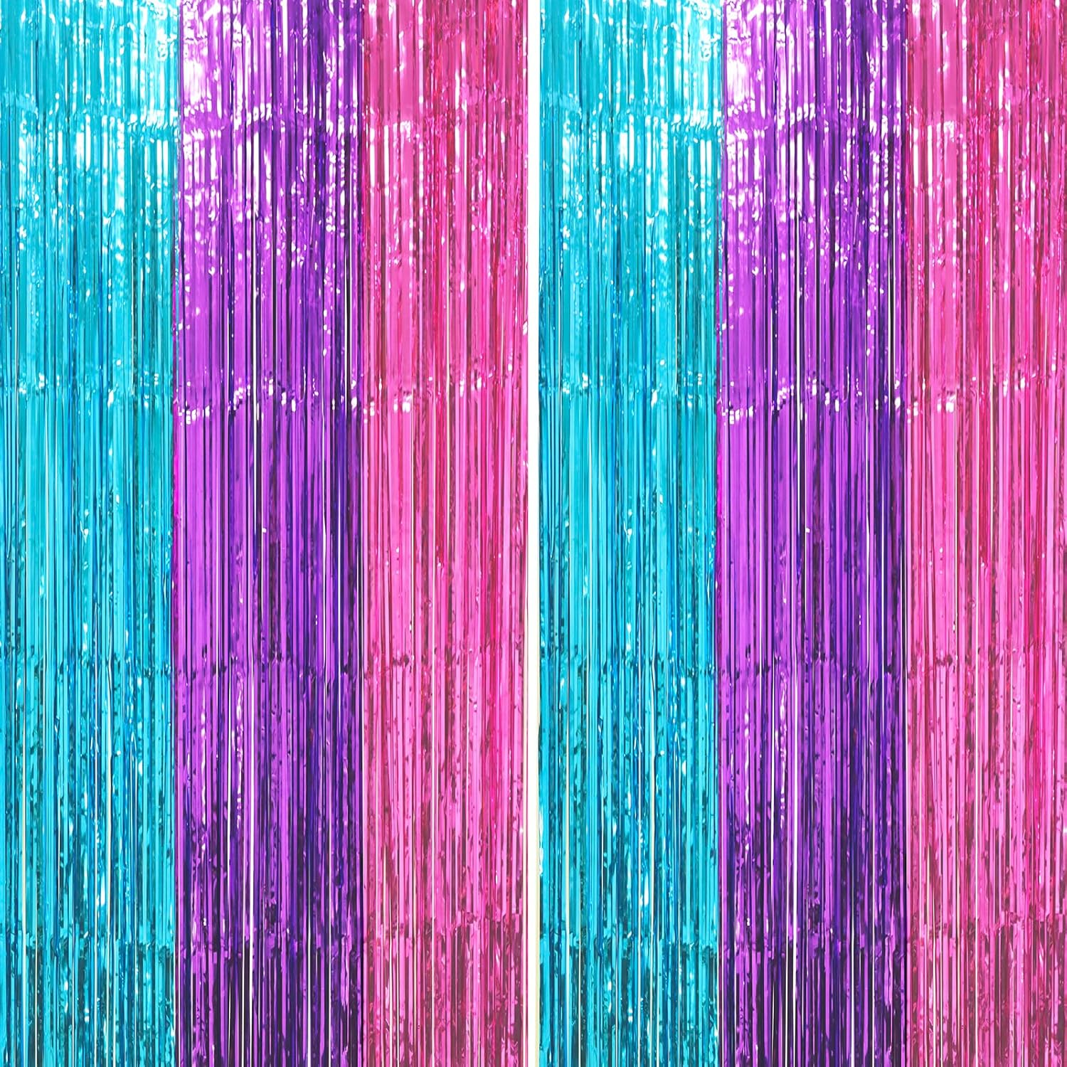 2 Pack Blue Purple Pink Foil Fringe Backdrop Curtains, Tinsel Streamers Party Decorations, Fringe Backdrop, Door Shimmer for Mermaid or Birthday Party