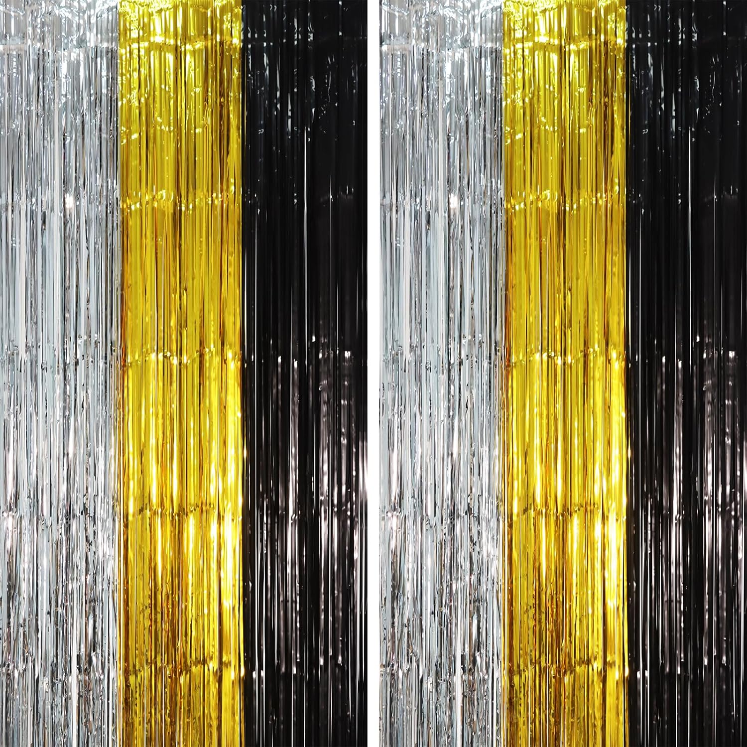 2 Pack Black Gold Silver Foil Fringe Backdrop Curtains, Tinsel Streamers Party Decorations, Fringe Backdrop, Door Shimmer for New Years or Birthday Party