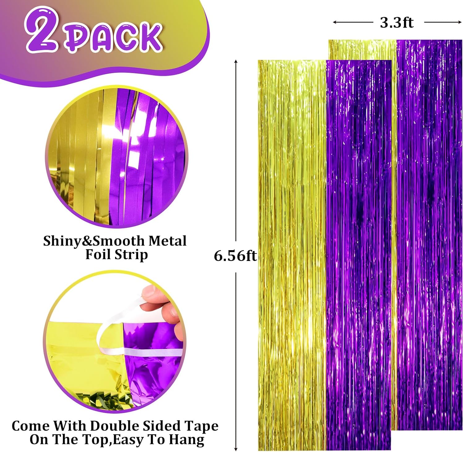 - Stunning Decorative Set: You'll receive 2 pcs purple gold foil fringe backdrop curtains, each measuring 3.28 ft (wide)Γ6.56 ft (drop). Enough length foil fringe curtains backdrops are perfect for the door or wall to create an impressive decoration