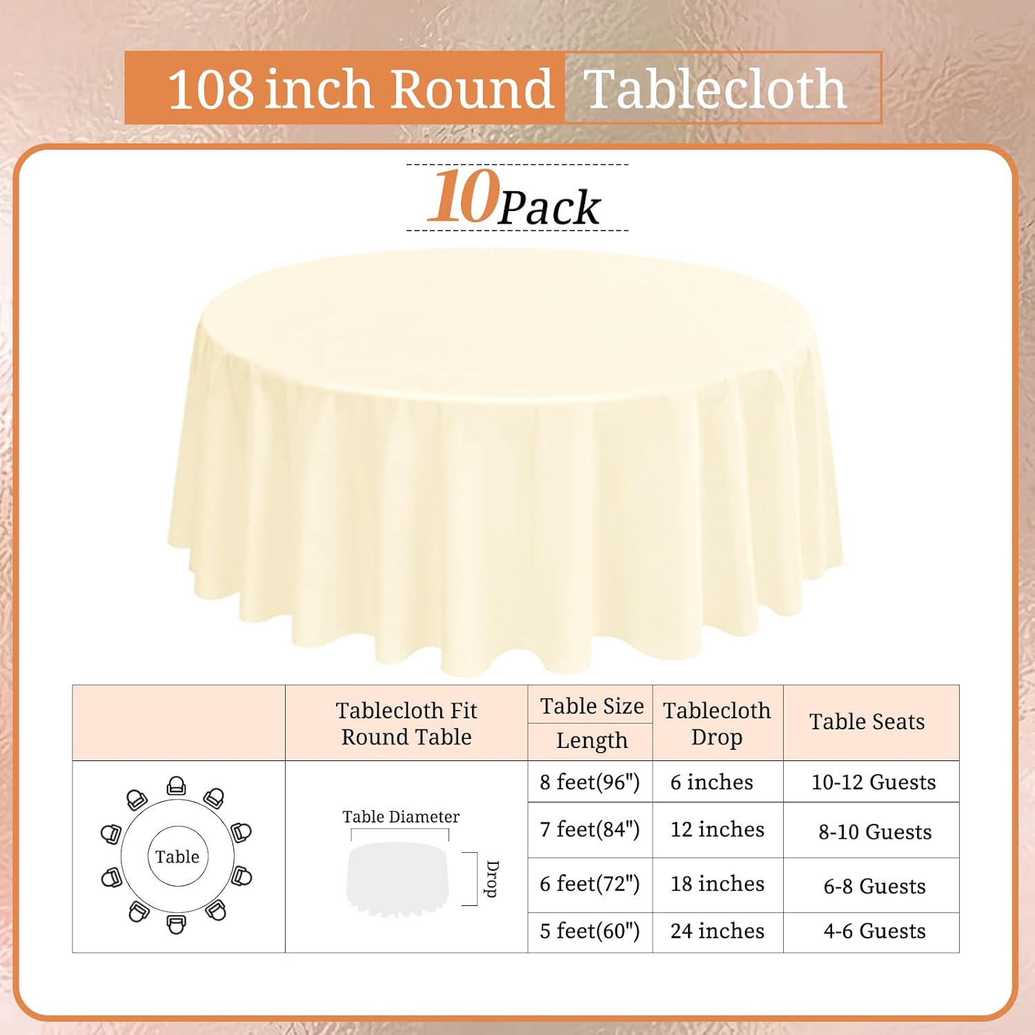 - 【Superior Tablecloth Material】: You will get 10 pack Beige round tablecloth, this reusable and easy to clean tablecloth is made from180 GSM 100% premium polyester fabric that resists wrinkling for an always crisp, polished look. Providing more convenience for your using and cleaning.