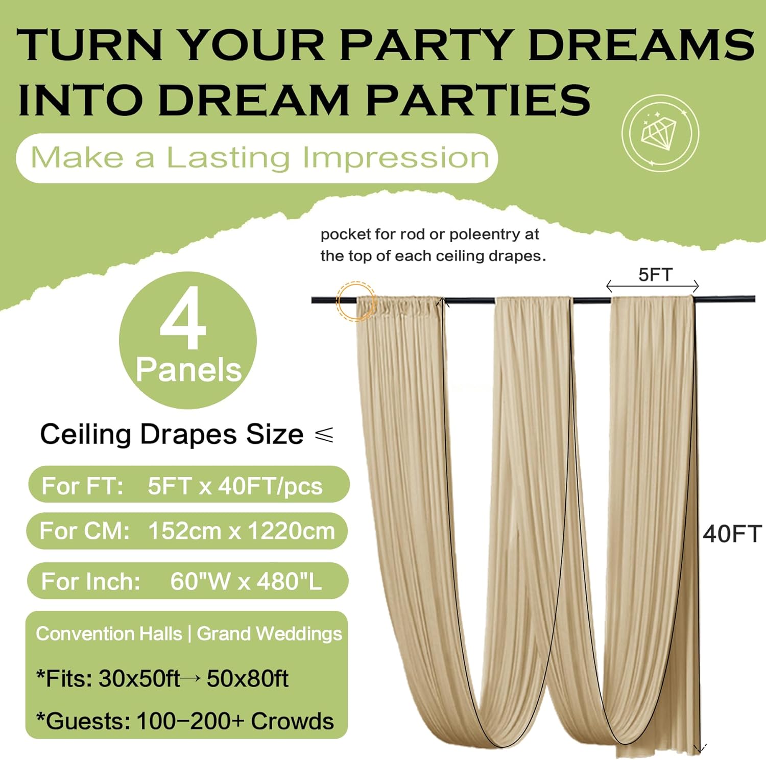 - 40ft Extra Long Ceiling Drapes: 4 Panels 5ftx40ft Beige Backdrop Curtains for Parties. Totally 20FT(Width) x 40FT(Height). cortinas para fiestas decoracion.