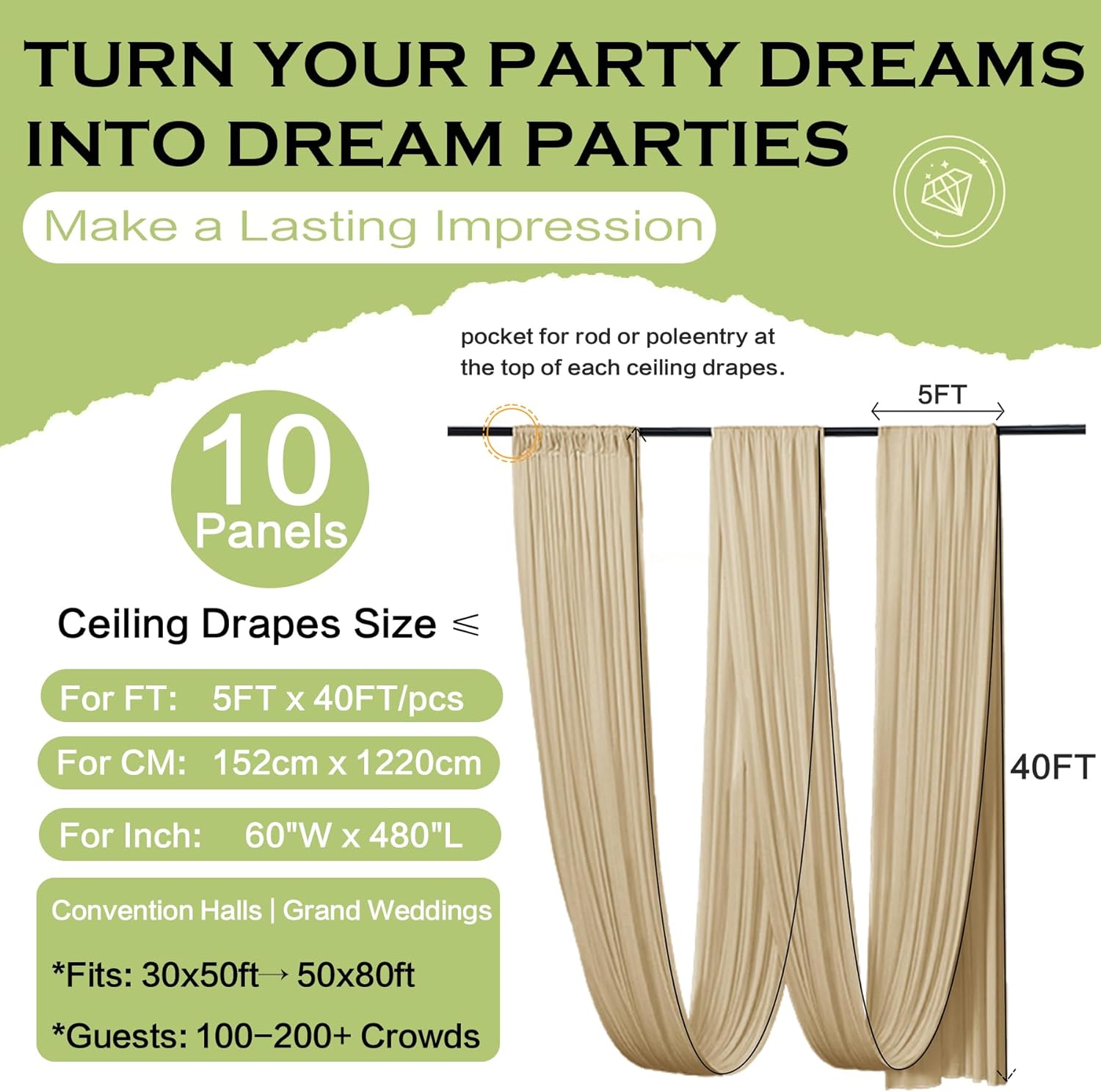 PartyVillage 50ftx40ft Beige Ceiling Curtain for Wedding Parties – 10 Panels Wrinkle-Free 40 FT Long Tent Draping Curtains for Wedding, Birthday & Theme Parties, 40ft Height with Rod Pocket