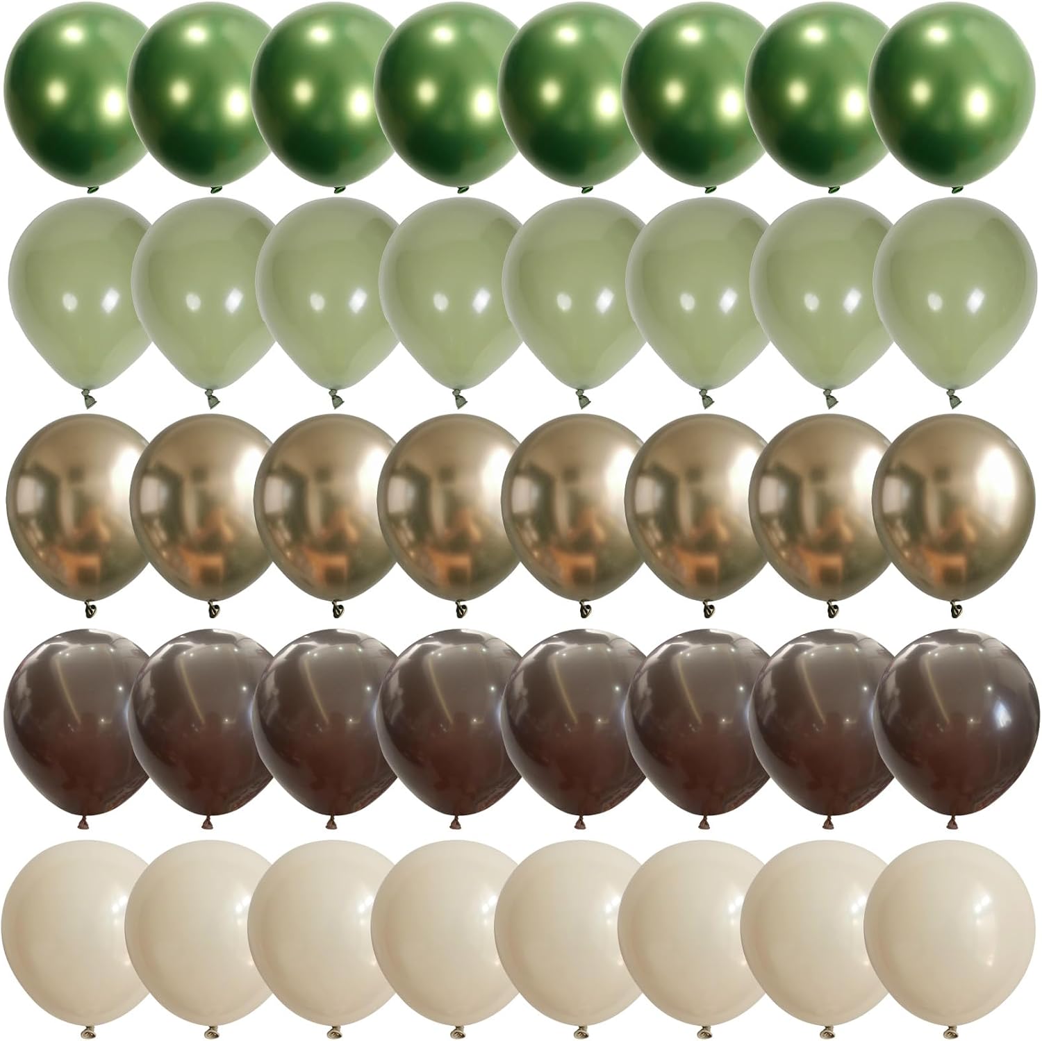 - Party Balloons Set: The camping balloons set have 60pcs 12inch helium balloons, include 20pcs sage green balloons, 13pcs cocoa dark brown balloons, 12pcs beige cream balloons, 7pcs chrome gold balloons, 8pcs chrome sage green balloons, 2pcs balloon ribbon (white, bright green).