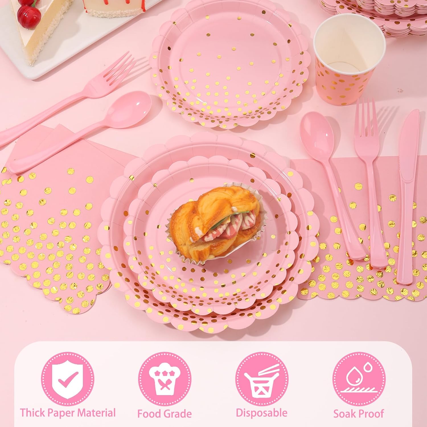 - 【Disposable】The pink party plates are disposable and durable, with raised edges to prevent food from leaking. After the party, you can throw the pink disposable plates directly into the trash can without cleaning. You can have more time to enjoy a wonderful and unforgettable party time with your family and friends
