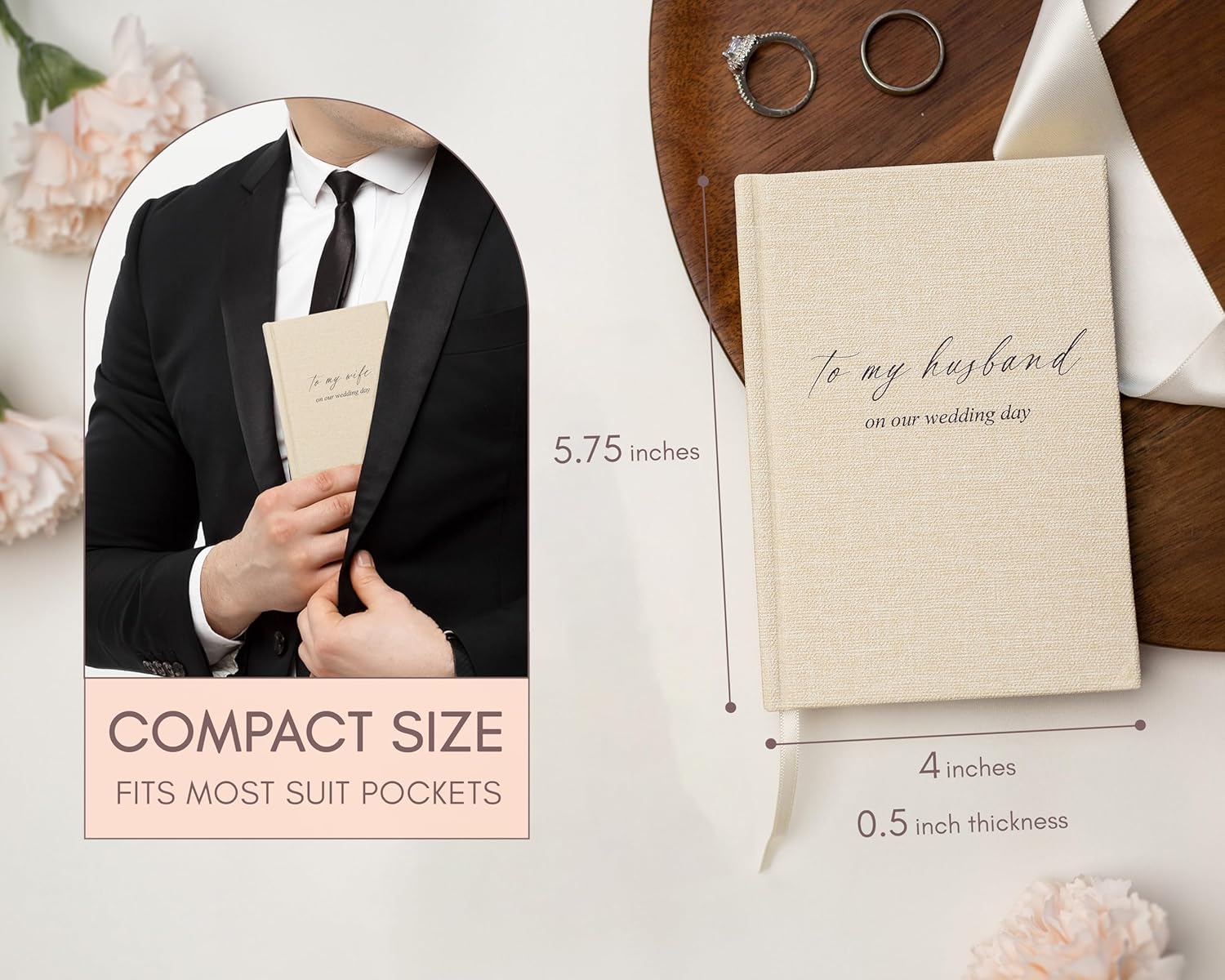 - Measuring at 5.75 x 4 x .5 inches, this vow book set is designed to be conveniently portable yet substantial enough to hold your most cherished words. The books are made with premium quality materials, featuring 140 gsm paper that is thick and luxurious to the touch. The 40 lined pages on each book offer ample space for couples to write their vows, while the compact size makes them easy to carry and store, allowing couples to cherish their promises for years to come.