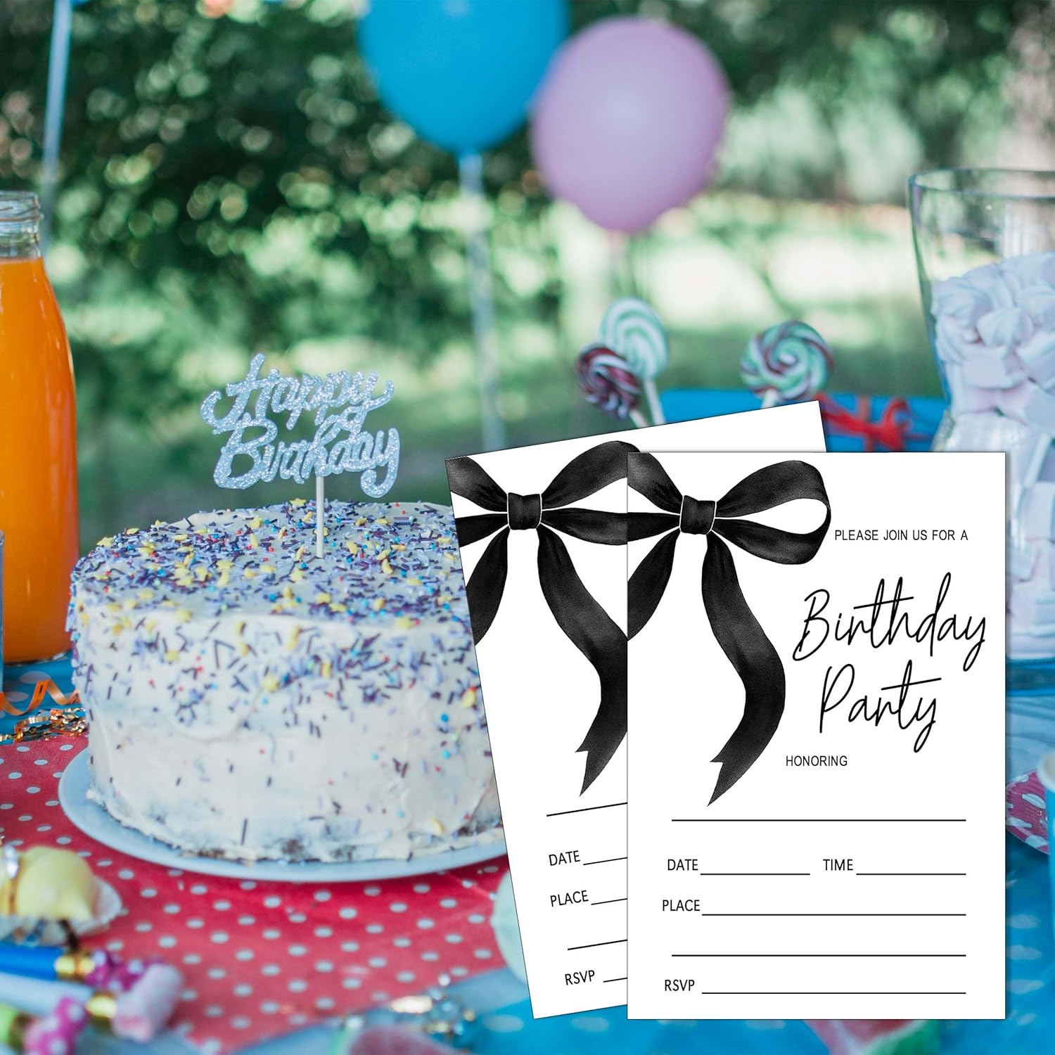 SIXEIGHT Black Bow Birthday Invitations, Black Ribbon Bow Birthday Party Invitations, 20 Party Invitations with Envelopes for Girls Boys, Birthday Party Favor & Decoration (4"x6")-A08