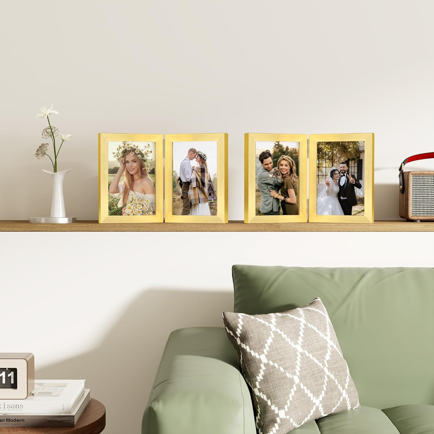 decorUhome Double 5x7 Picture Frame Vertical, Engineered Wood Bifold Photo Frame with Plexiglass for Tabletop Display, 5x7, Gold