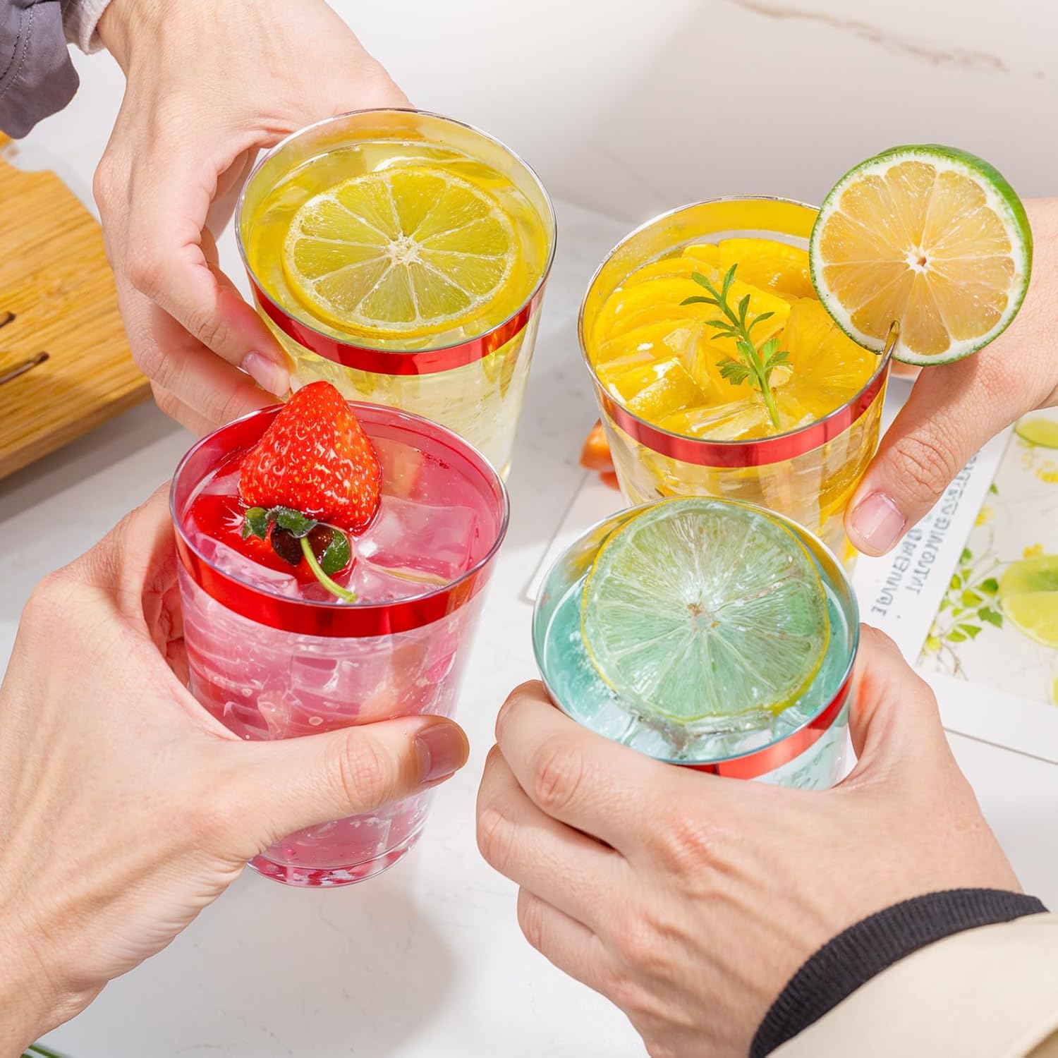 - ELEGANT AND UPSCALE: Add a touch of elegance and refinement to your table with our red rim plastic cups, These clear red disposable cups for party can be matched with beverages of any color and all upscale events, for a fraction of the real clear plastic cups 10 oz prices.