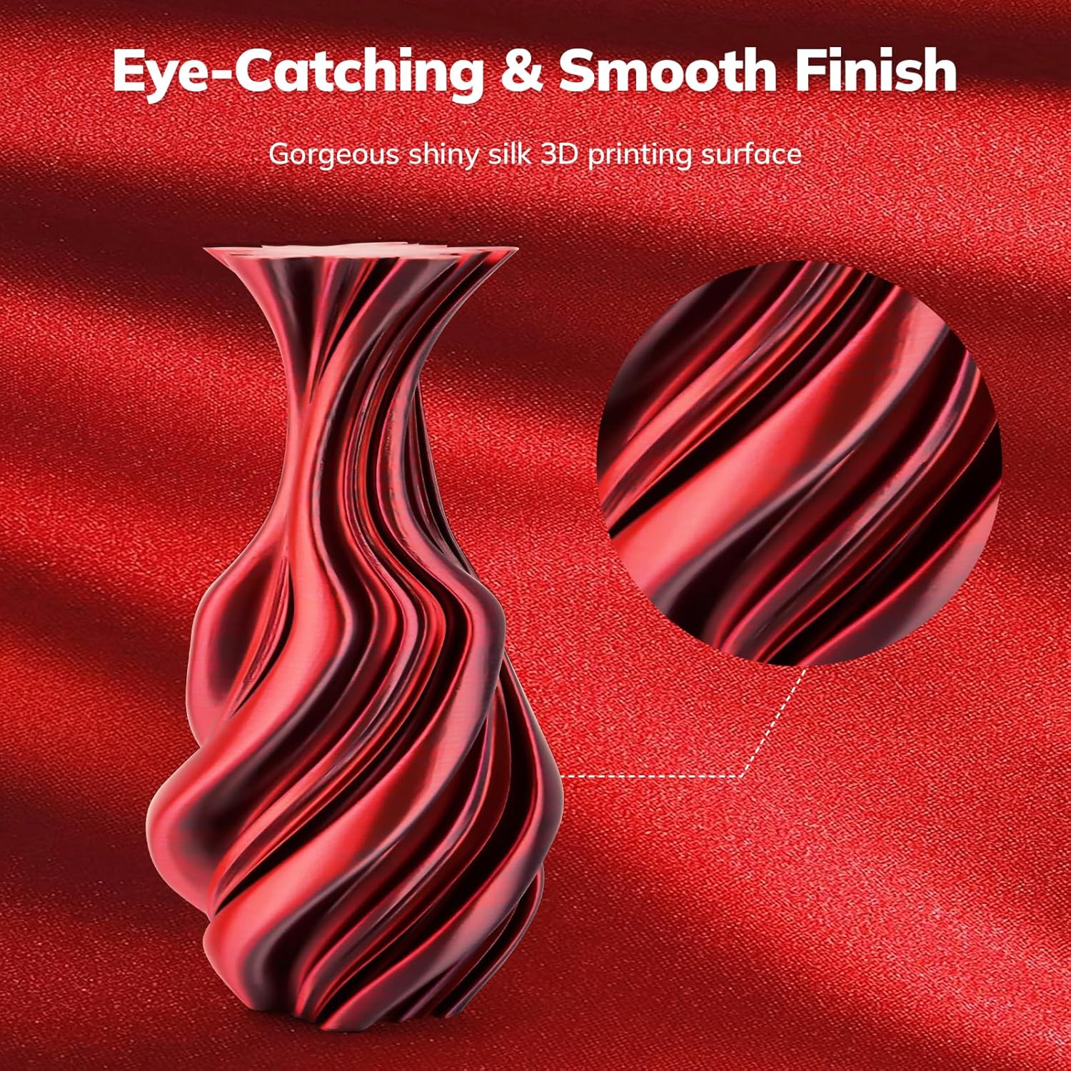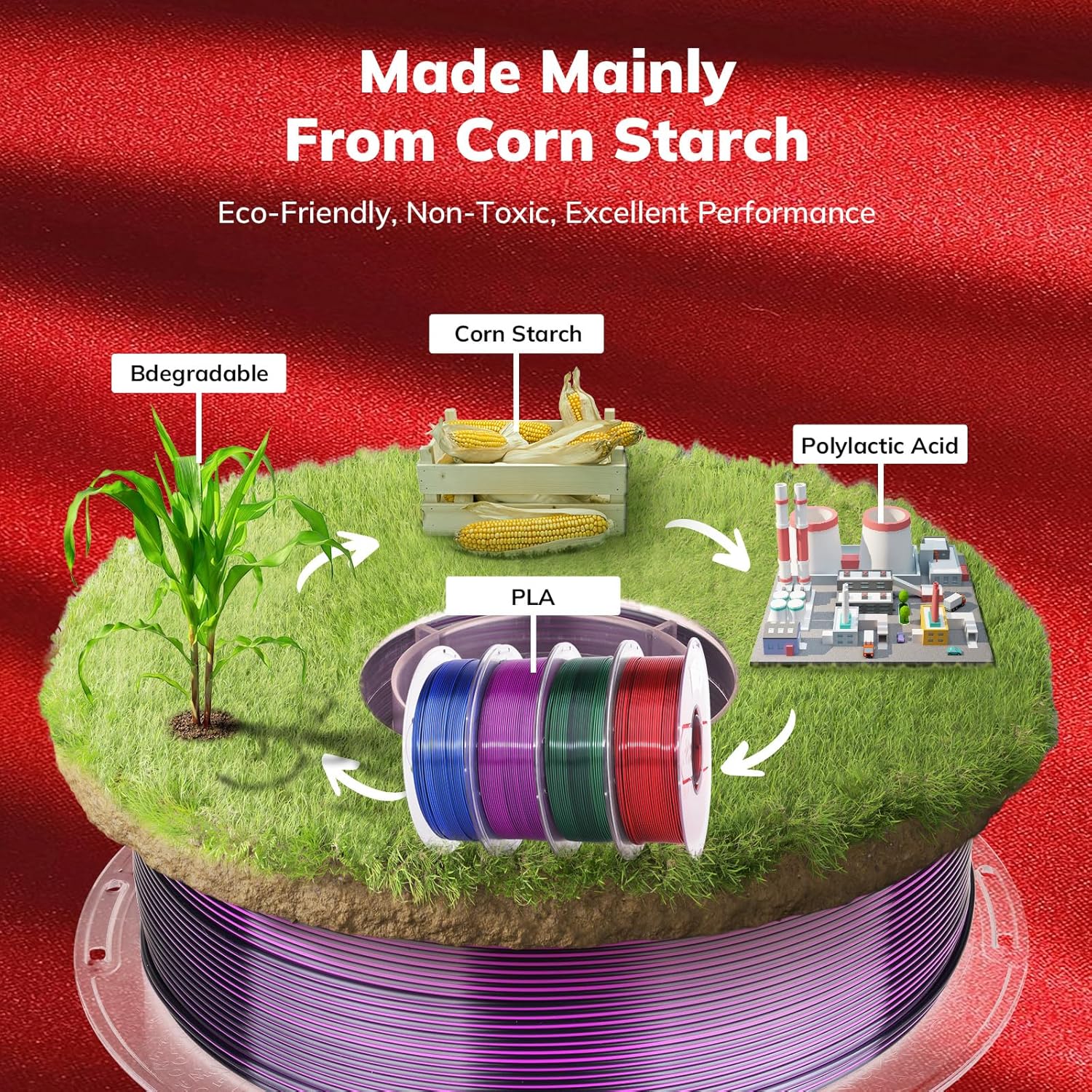 - 【Silk Dual Color 1KG X 4 PLA Bundle】Increase in weight but decrease in price, great choice for AMS! Silk PLA filament Bundle delivers an eye-catching and smooth finish, making your 3d prints stand out from the crowd. Shiny Black Purple/Black Red/Black Green/Black Blue, make the two sides of your print appear in different colors