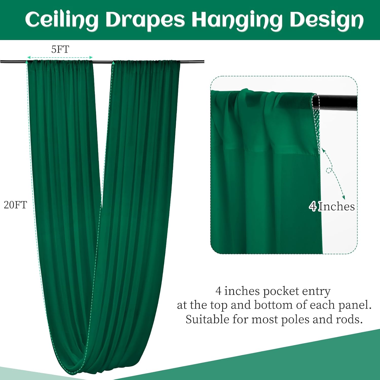 - Chiffon Ceiling Drapes: The package include 6 panels emerald green wedding ceiling drapes (without hanging pieces). Each wedding extra long curtain measure for 5 feet width x 20 feet length. The sufficient quantity can meet your demands for decorating your weddings, parties, receptions. It will help to create a delicate and aesthetic sense to your wedding ceiling decoration.