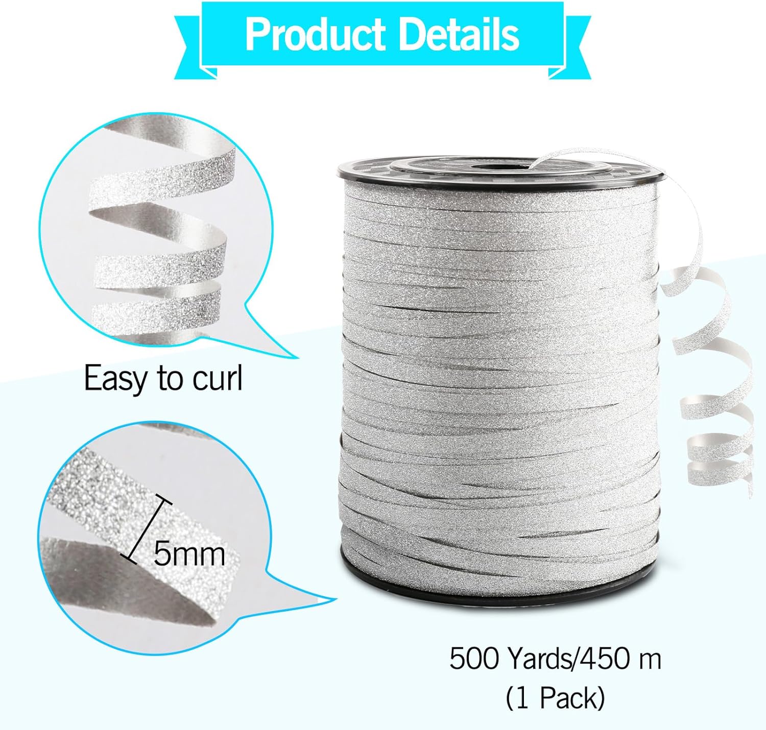 - Extra-Long Roll Curling Ribbon: Our gift wrapping curling ribbon comes with a lot which measures 500 yards 1 roll by 3/16 inch in width (Width: 5mm, Length: 450m). Perfect for gift wrapping, christmas, balloons, florist, flowers decorations. Curly Ribbon is Providing ample length for any project or occasion, enough for you to use in various parties throughout the year.