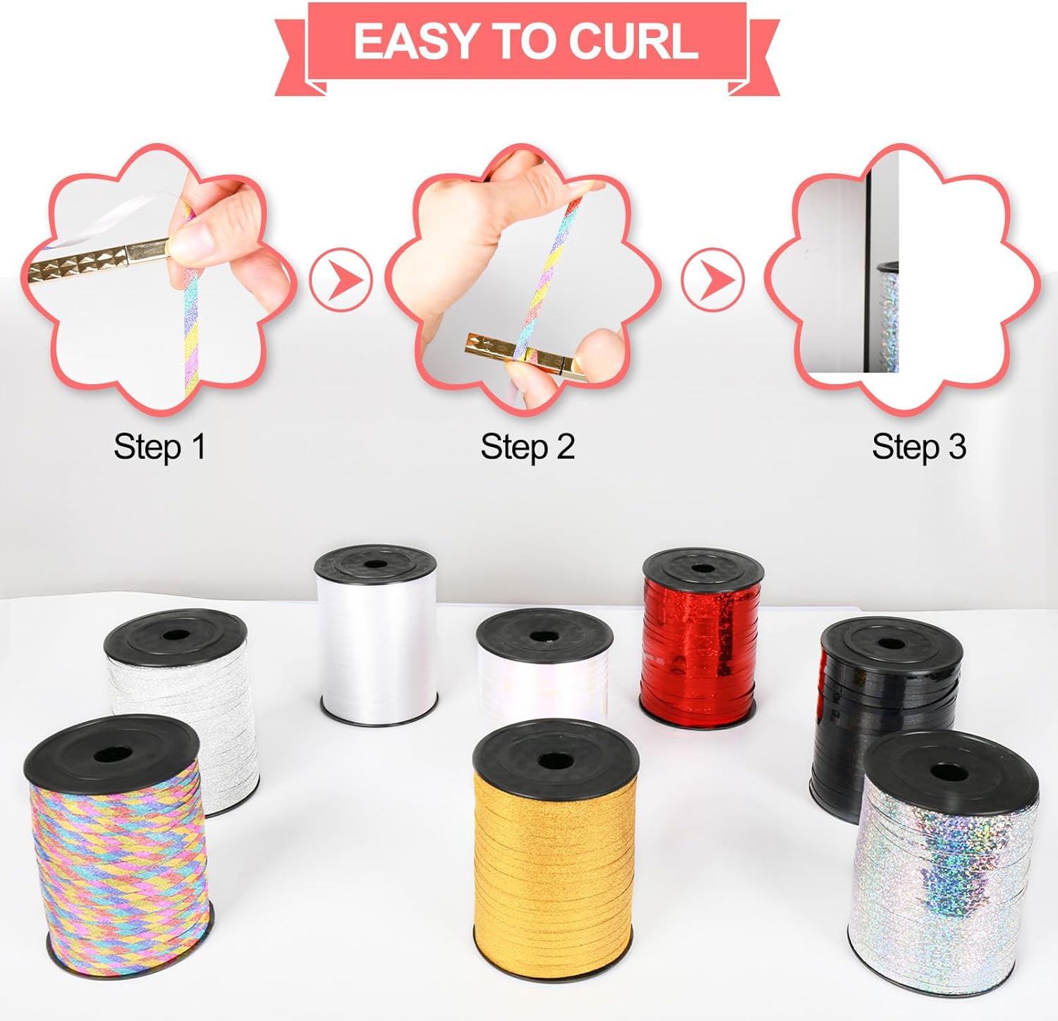 - Extra-Long Roll Curling Ribbon: Our gift wrapping curling ribbon comes with a lot which measures 500 yards 1 roll by 3/16 inch in width (Width: 5mm, Length: 450m). Perfect for gift wrapping, christmas, balloons, florist, flowers decorations. Curly Ribbon is Providing ample length for any project or occasion, enough for you to use in various parties throughout the year.