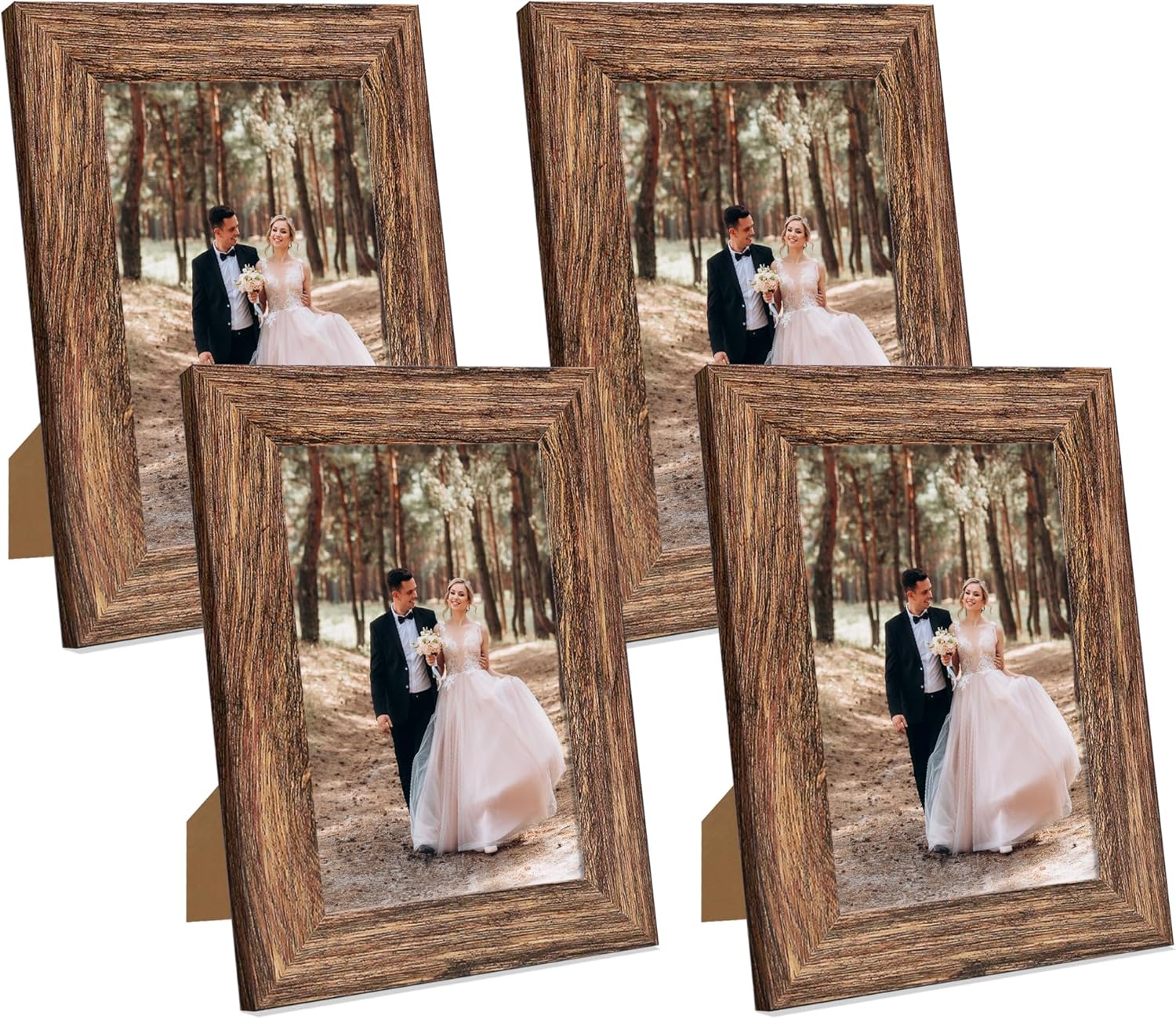 5x7 Picture Frame Set of 4, High Definition Glass Brown Frame, 5 x 7 Wood Rustic Photo Frames for Horizontal or Vertical Table Top and Wall Mounting