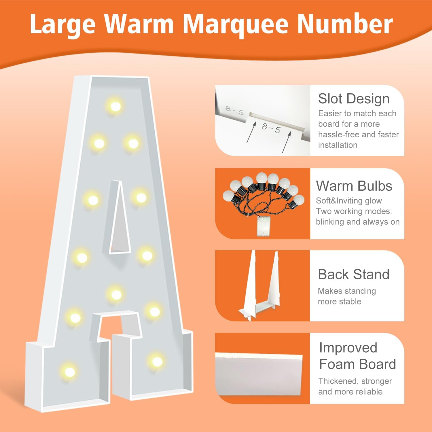 - IMPROVED FOAM BOARDS: Our marquee letters are made from high-density thickened foam boards, the slots and connectors can be tightly linked togethe for better stability. Each letter has a sturdy back stand to ensure that your party marquee sign will not tip over. (Tips: When outdoors, please place something heavy on the back stand to prevent the letter sign from blowing over).