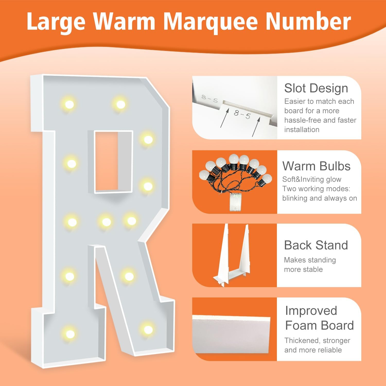 - IMPROVED FOAM BOARDS: Our marquee letters are made from high-density thickened foam boards, the slots and connectors can be tightly linked togethe for better stability. Each letter has a sturdy back stand to ensure that your party marquee sign will not tip over. (Tips: When outdoors, please place something heavy on the back stand to prevent the letter sign from blowing over).