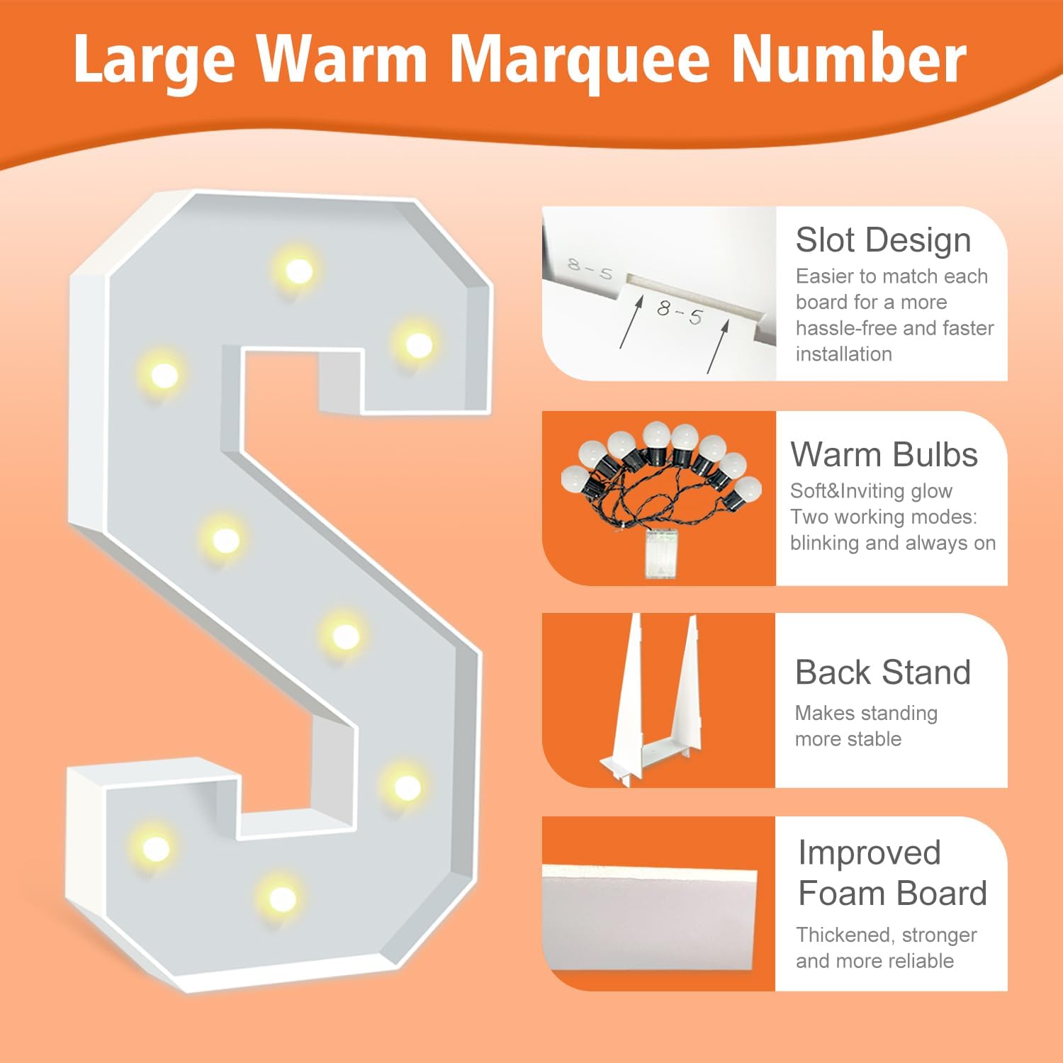 - BRIGHT & SAFE LIGHTING: The light up letters are powered by 3 AA batteries(not included), ensuring the safety of all your guests. There's a switch on the battery compartment, you can switch the Warm Yellow led light from steady to cheerful flashing, ideal for creating a cozy, inviting ambiance to any celebration or event.