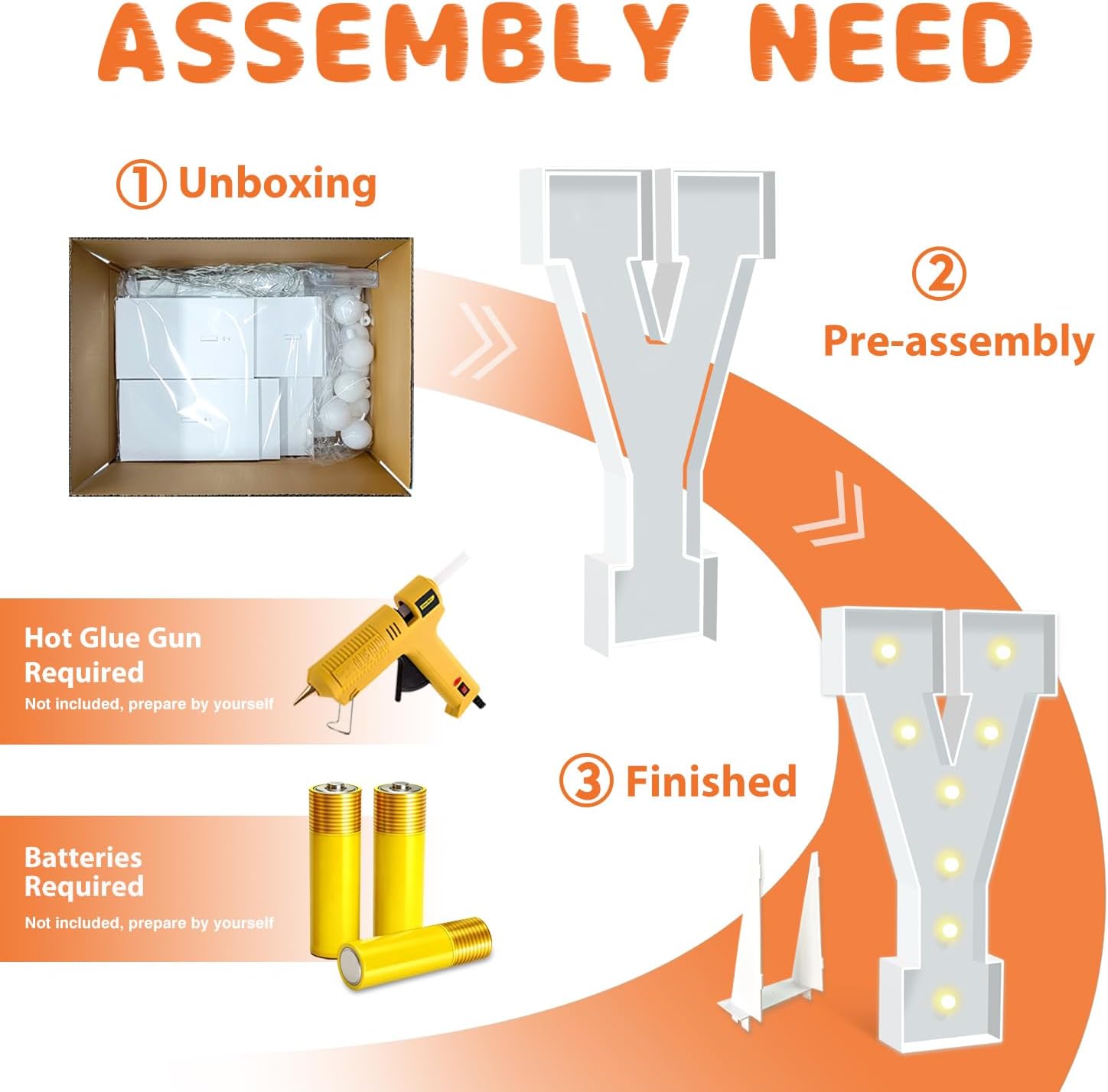 - BRIGHT & SAFE LIGHTING: The light up letters are powered by 3 AA batteries(not included), ensuring the safety of all your guests. There's a switch on the battery compartment, you can switch the Warm Yellow led light from steady to cheerful flashing, ideal for creating a cozy, inviting ambiance to any celebration or event.