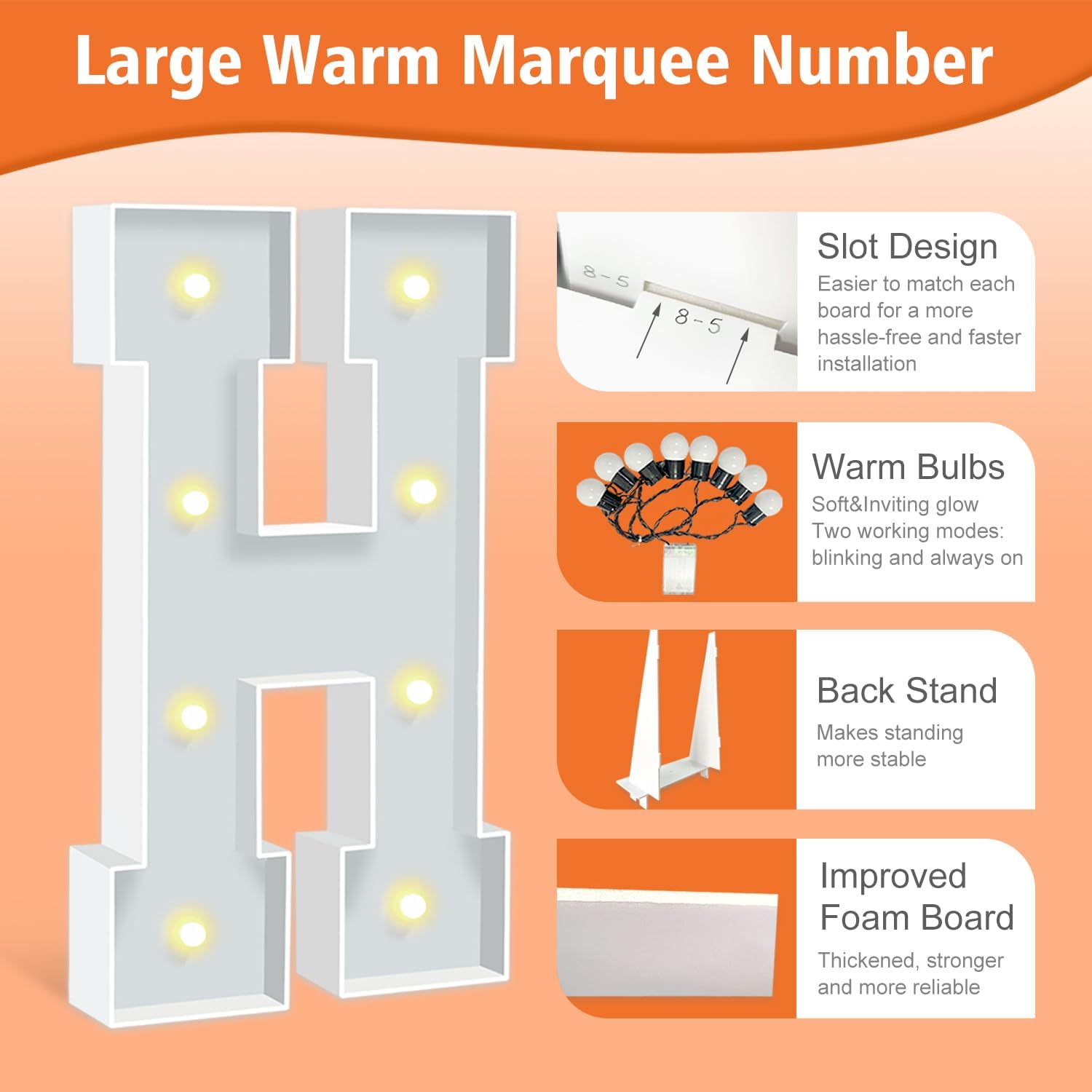 - IMPROVED FOAM BOARDS: Our marquee letters are made from high-density thickened foam boards, the slots and connectors can be tightly linked togethe for better stability. Each letter has a sturdy back stand to ensure that your party marquee sign will not tip over. (Tips: When outdoors, please place something heavy on the back stand to prevent the letter sign from blowing over).