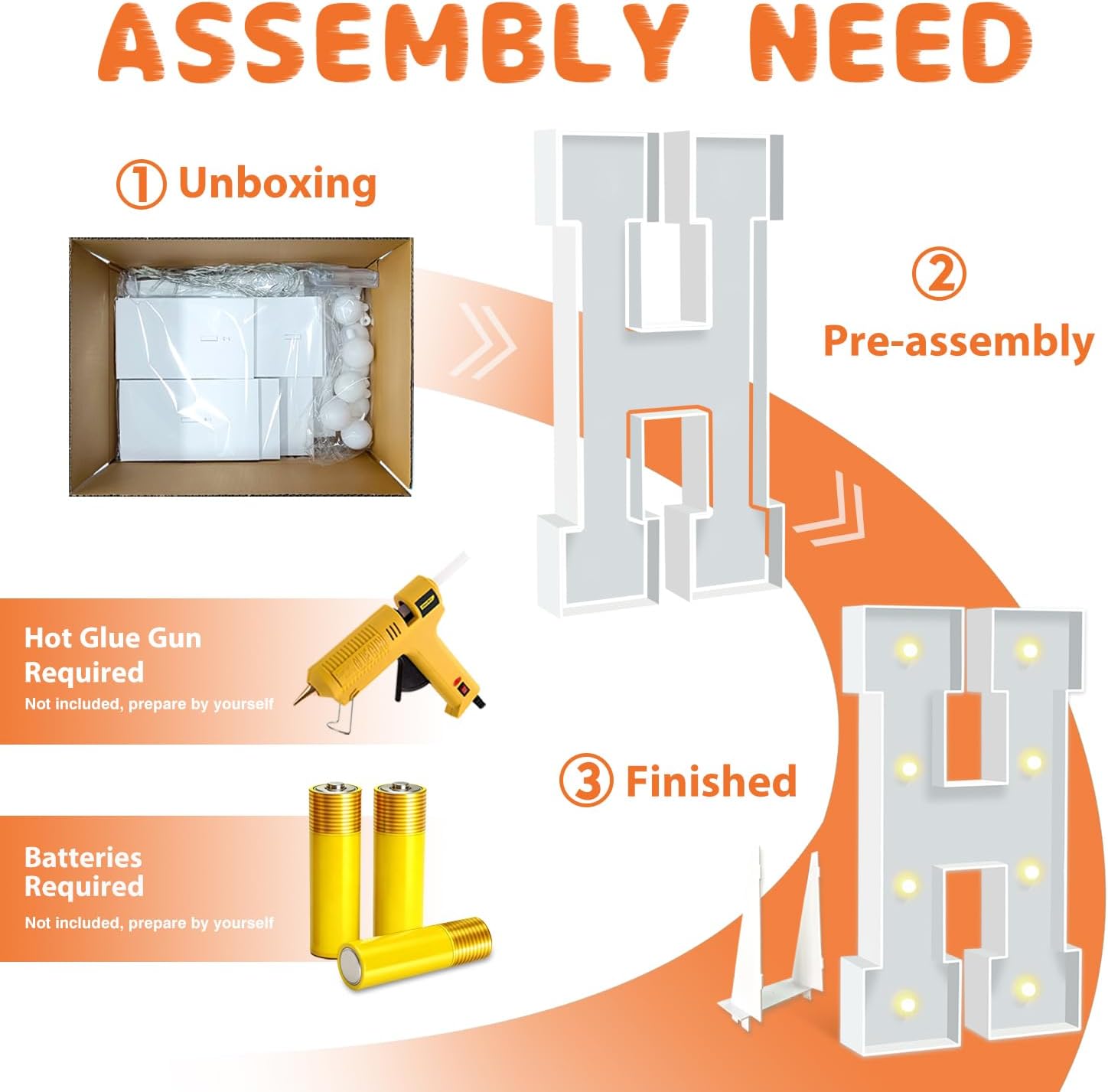 - BRIGHT & SAFE LIGHTING: The light up letters are powered by 3 AA batteries(not included), ensuring the safety of all your guests. There's a switch on the battery compartment, you can switch the Warm Yellow led light from steady to cheerful flashing, ideal for creating a cozy, inviting ambiance to any celebration or event.