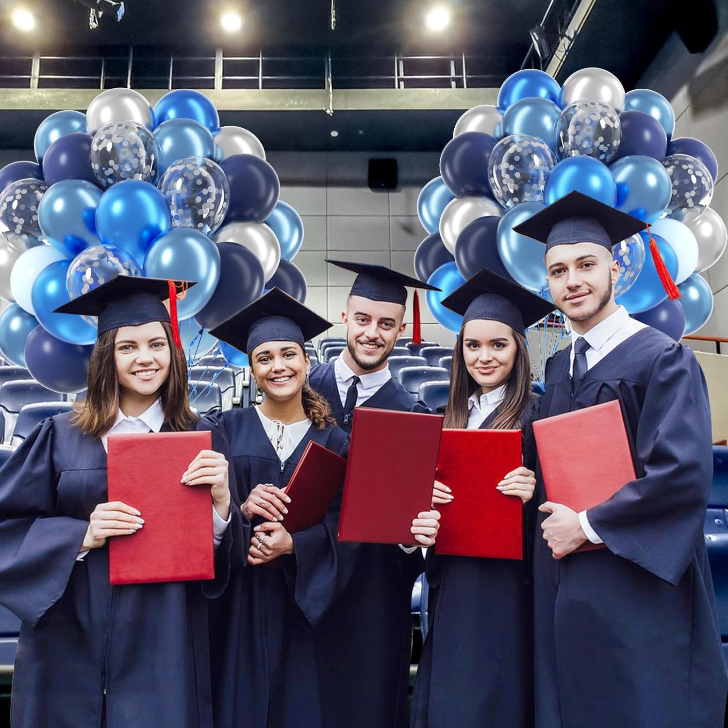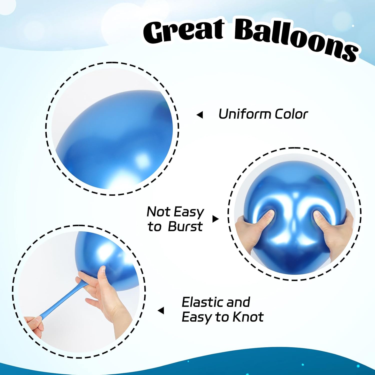 - Package Include: The blue and silver balloons include 12inch metallic blue balloonsx10, 12inch metallic light blue balloonsx10, 12inch metallic silver balloonsx10, 12inch navy blue balloonsx10, 12inch pastel blue balloonsx10, 12inch silver confetti balloonsx10, glue dotsx20, blue ribbonx1
