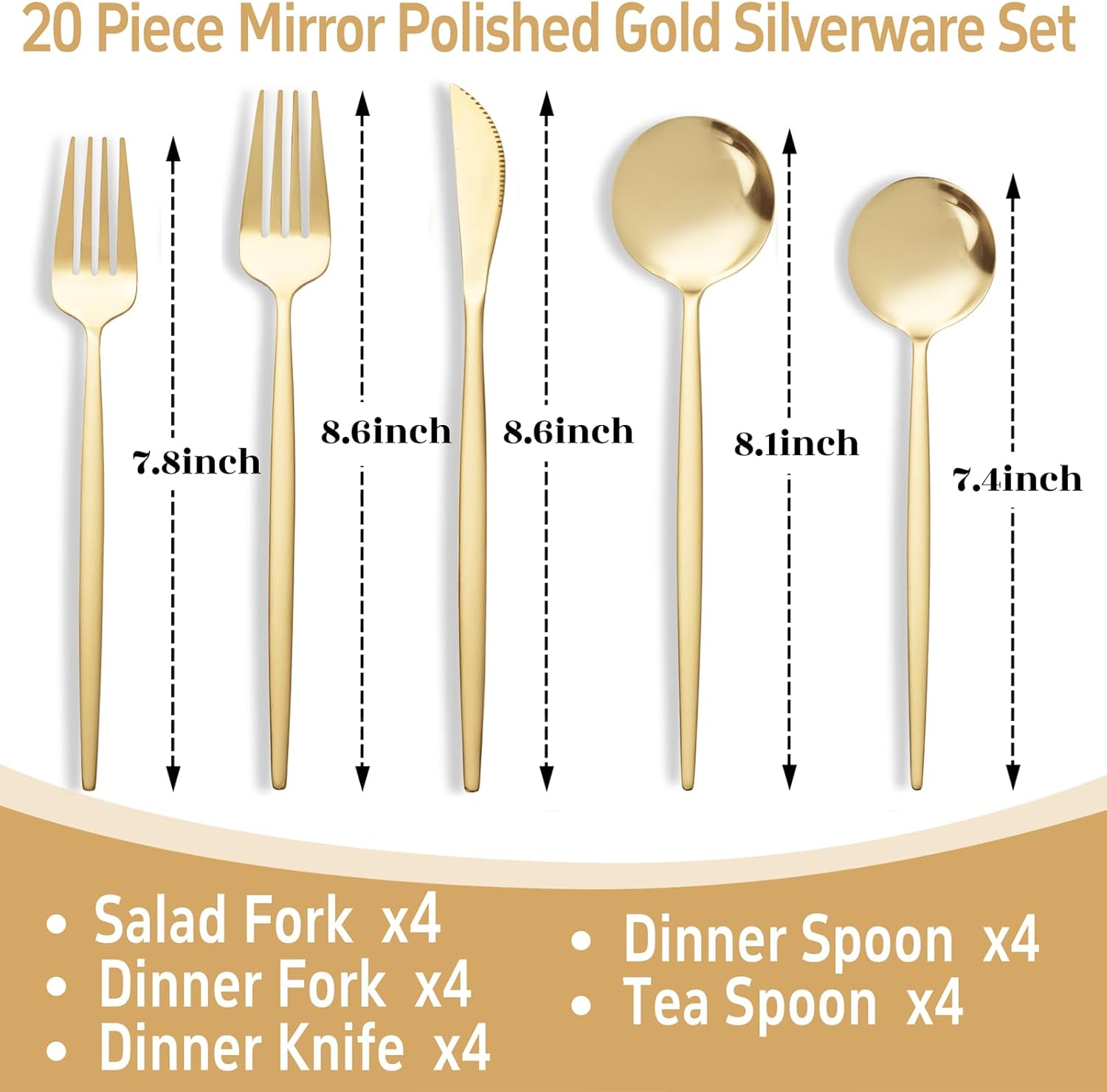 - 20-PIECE CUTLERY SET FOR 4: NOUCCR gold utensils includes 4 dinner forks, 4 dinner spoons, 4 dinner knives, 4 salad/dessert forks and 4 dessert/teaspoons, a must-have for your home or restaurant. The gold utensils set stainless steel is perfect for dinners, gatherings, parties, holiday celebrations or birthdays