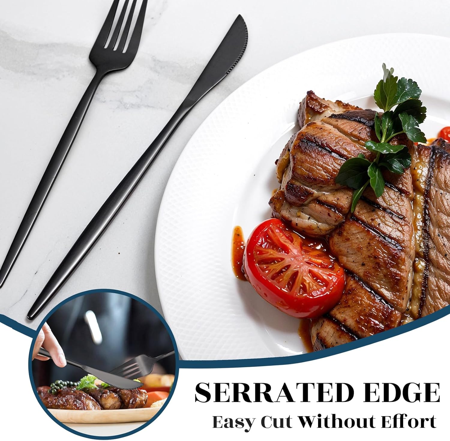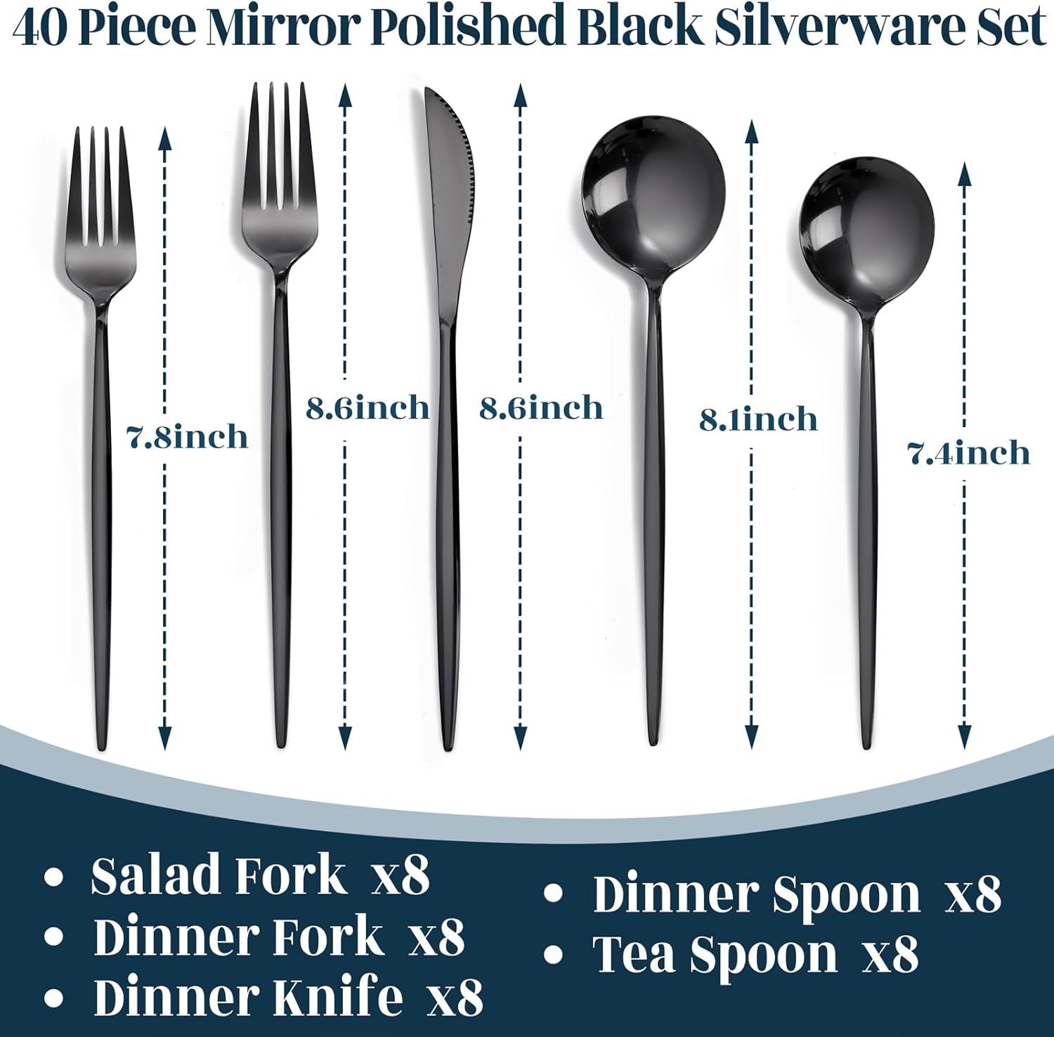 - 8-PERSON CUTLERY: This stainless steel black utensil set includes 8 table knives, 8 table forks, 8 table spoons, 8 tea spoons, and 8 salad forks. The black silverware set for 8 has the right size and weight to meet your normal use