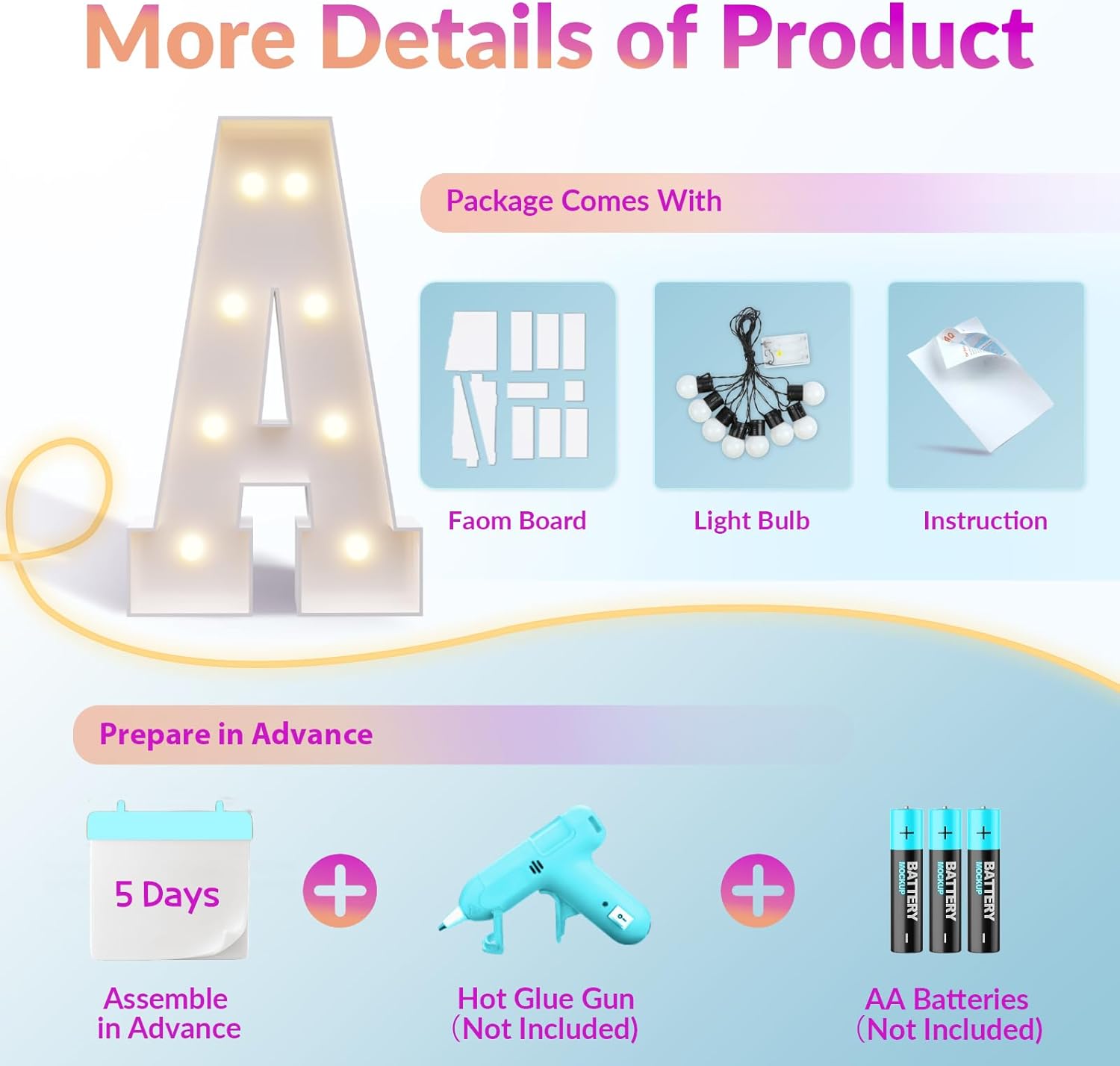 - Crafted from Sturdy Foam Board: Built with Sturdy foam board, our 3ft marquee light up letters provide exceptional stability and long-lasting performance. The included backstand ensures they stay firmly in place, offering worry-free party decorations
