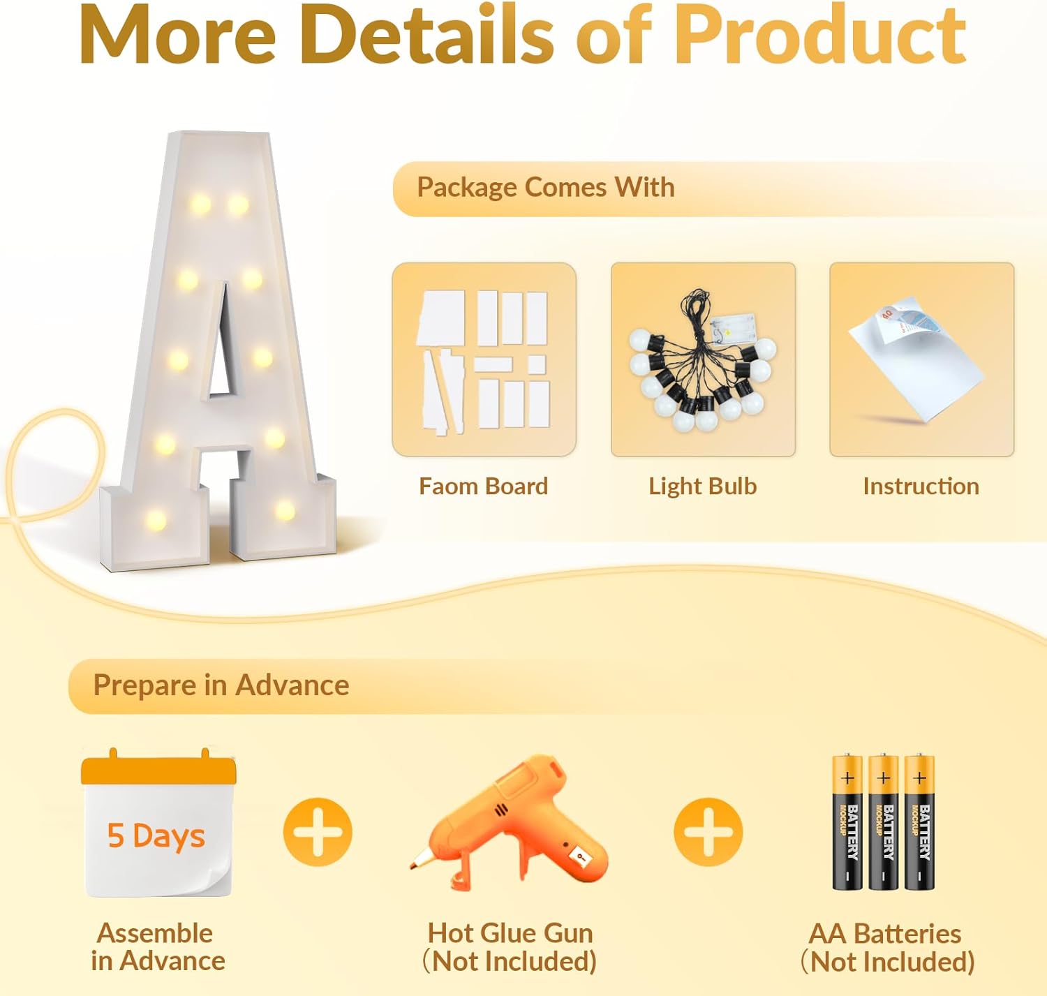 - Quality Customer Service: Your satisfaction is our top priority. If you encounter any issues about assembly, missing pieces, product damage and bulbs donβt work during using our big light up letters, feel free to contact us anytime, and we will be dedicated to providing solutions
