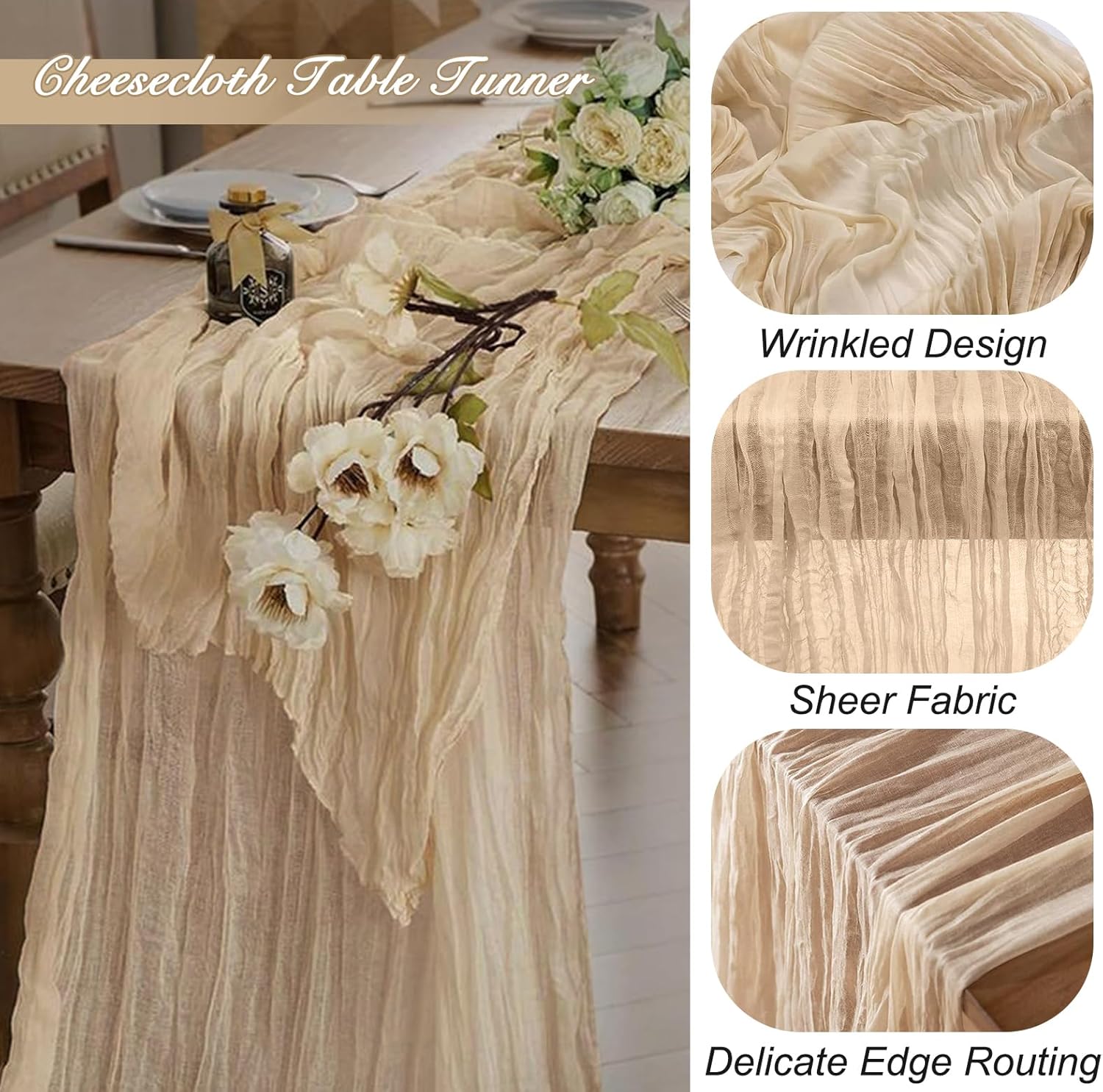 8 Pack 10Ft Beige Boho Gauze Cheesecloth Table Runner Long Wrinkled Sheer Romantic Table Cloths for Wedding Bridal Shower Birthday Party Table Decor