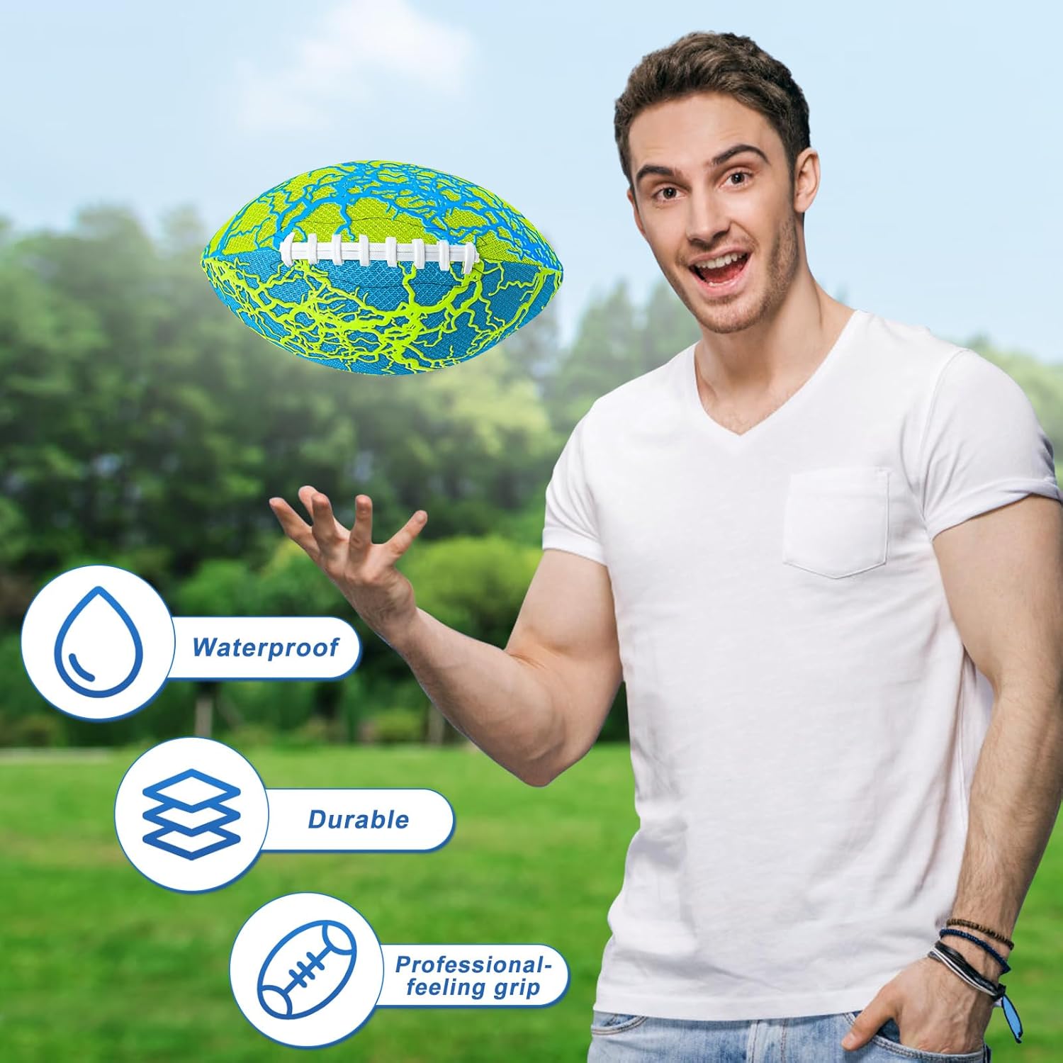 - Durable Waterproof Football - Made with high quality inflatable bladder and water-resistant soft fabric. Long lasting and waterproof. Les's play football in the water.