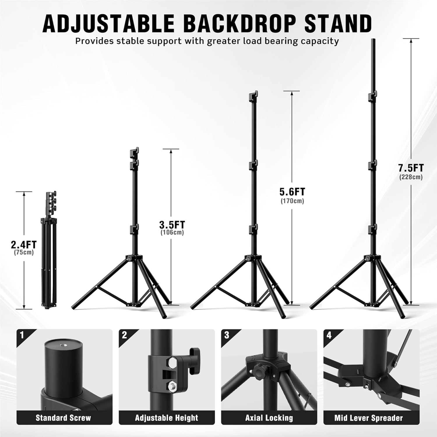 - ๐๐ฑ๐ท๐๐๐๐ฎ๐ฏ๐น๐ฒ ๐ฆ๐ถ๐๐ฒ ๐ณ๐ผ๐ฟ ๐ฉ๐ฒ๐ฟ๐๐ฎ๐๐ถ๐น๐ฒ ๐จ๐๐ฒ: This backdrop stand kit offers a height range of 2.4ft to 7.5ft and width options of 5.9ft, 7.9ft, and 10ft, giving you full flexibility for various event setups such as photo booths, weddings, baby showers, and studio work.