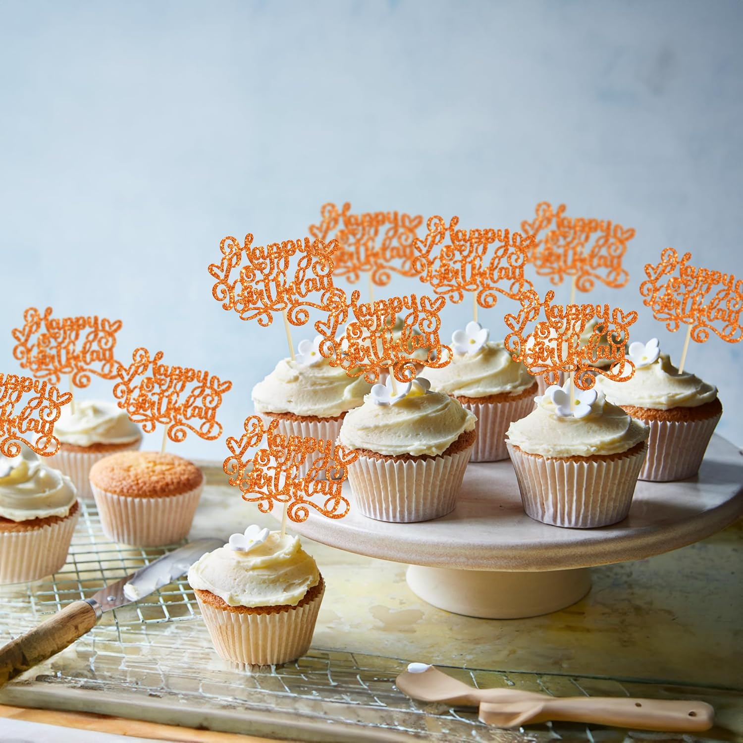 Gyufise 24Pcs Happy Birthday Cupcake Toppers Glitter Happy Birthday Cupcake Picks for Celebrating Happy Birthday Anniversary Theme Party Cake Decorations Supplies Orange