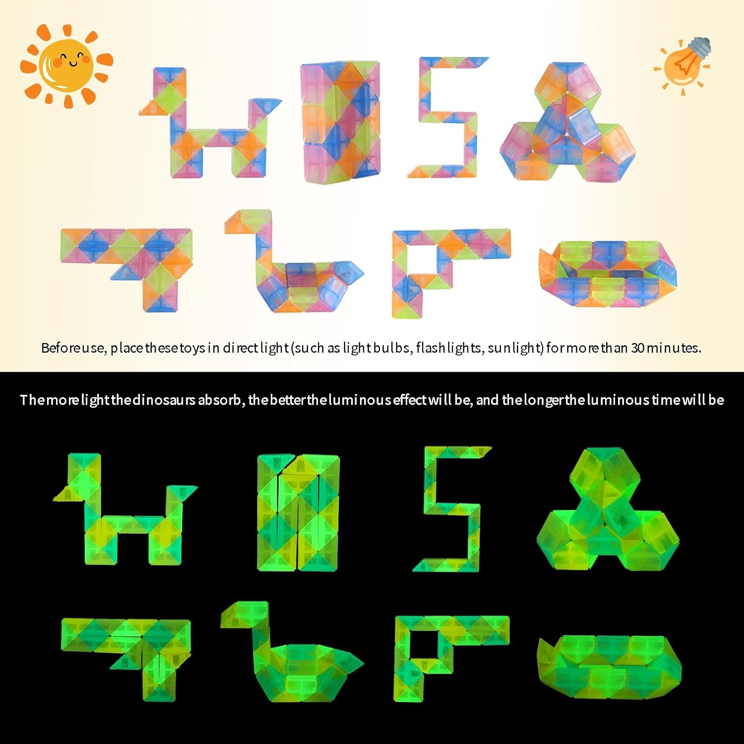 - NOTICE: The glow effect of Blue and green snake cube will be better than pink and yellow 3). The Fidegts snake cube will glow after it absorbs light. After absorbing light ( direct light under Bulb light, Flashlight,Sunlight) for over 30 minutes under sunlight or light, it will convert the absorbed light energy and then glow in the dark
