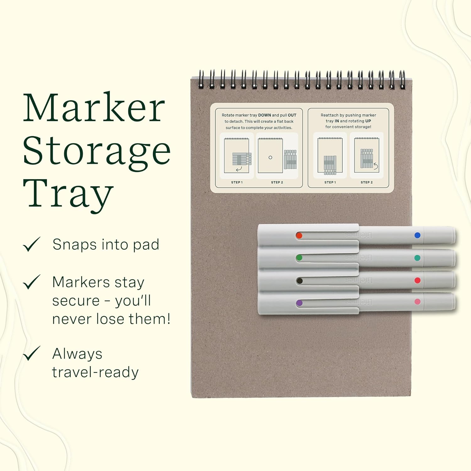 - Detachable Marker Storage Tray: The snap-in storage tray keeps your makers securely attached to the book, so you’ll never lose them, and everything stays together for easy, on-the-go fun!