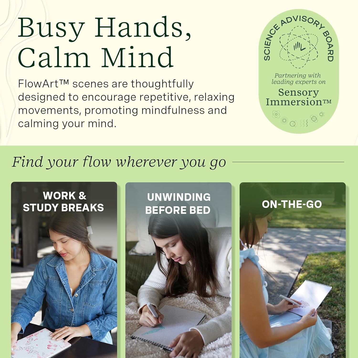 - Find Your Flow Wherever You Go: Busy your hands and calm your mind with portable activity pads, each with 20 meditative scenes designed to get you into a blissful flow state. Great for work and study breaks, unwinding before bed, or well-being on-the-go.