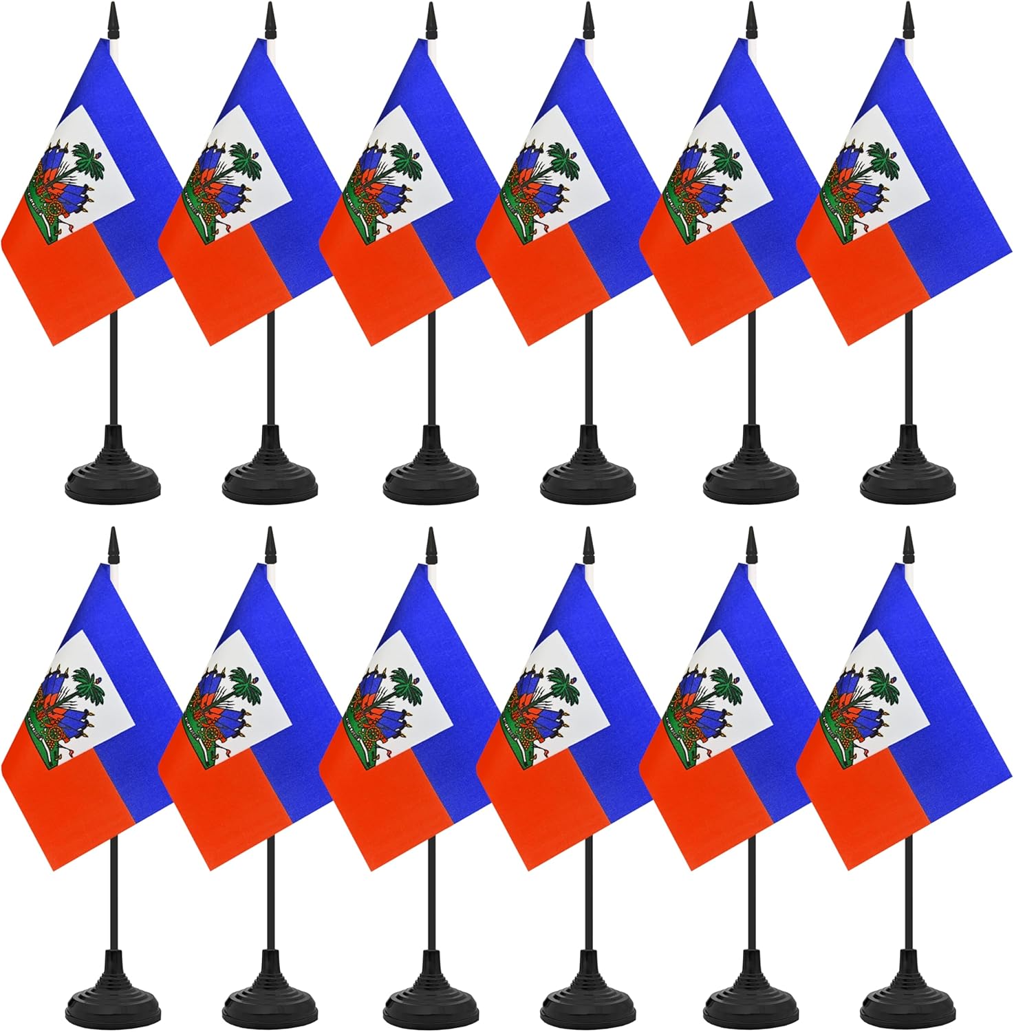 12 Pack Haiti Desk Flag Set, Haitian Table Office Flag, Small Miniature Desktop Flag With Black Pole and Black Base, Classroom, Offices Meeting Desk Decoration (Haiti)