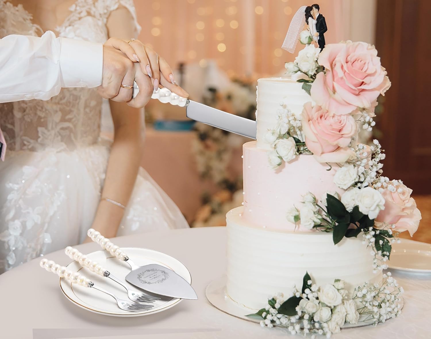- Luxurious Ceramic Pearl Handle Design: Crafted from high-quality food-grade stainless steel, this luxurious cake cutting set features a polished mirror finish, serrated edge for easy slicing, and elegant ceramic pearl handles that add a touch of luxury and sophistication