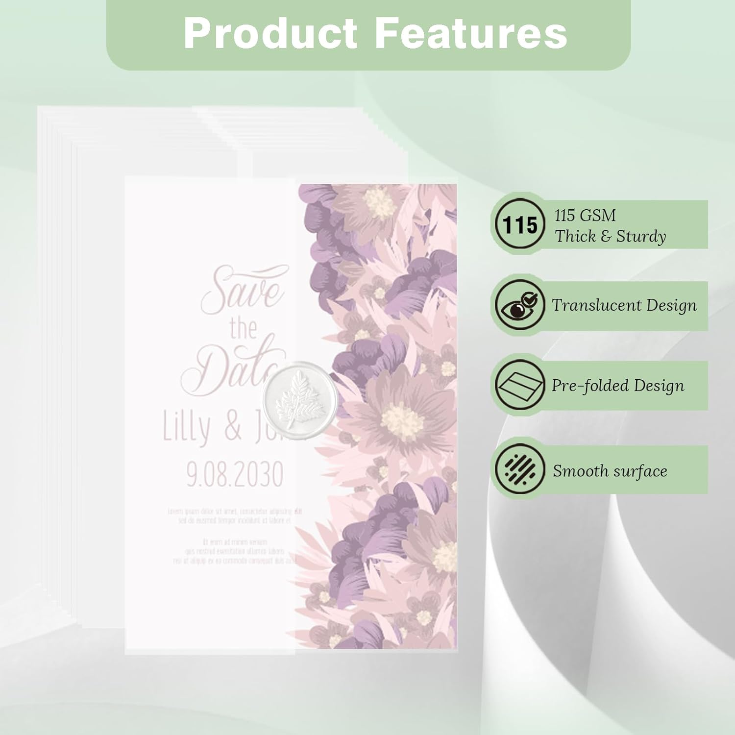 - Premium Quality Material: Made from high quality 115GSM thick translucent vellum paper. Smooth, lightweight, and resistant to tearing or deformation. The semi-transparent design provides a subtle yet beautiful overlay that enhances the presentation of your invitations without hiding the details underneath.