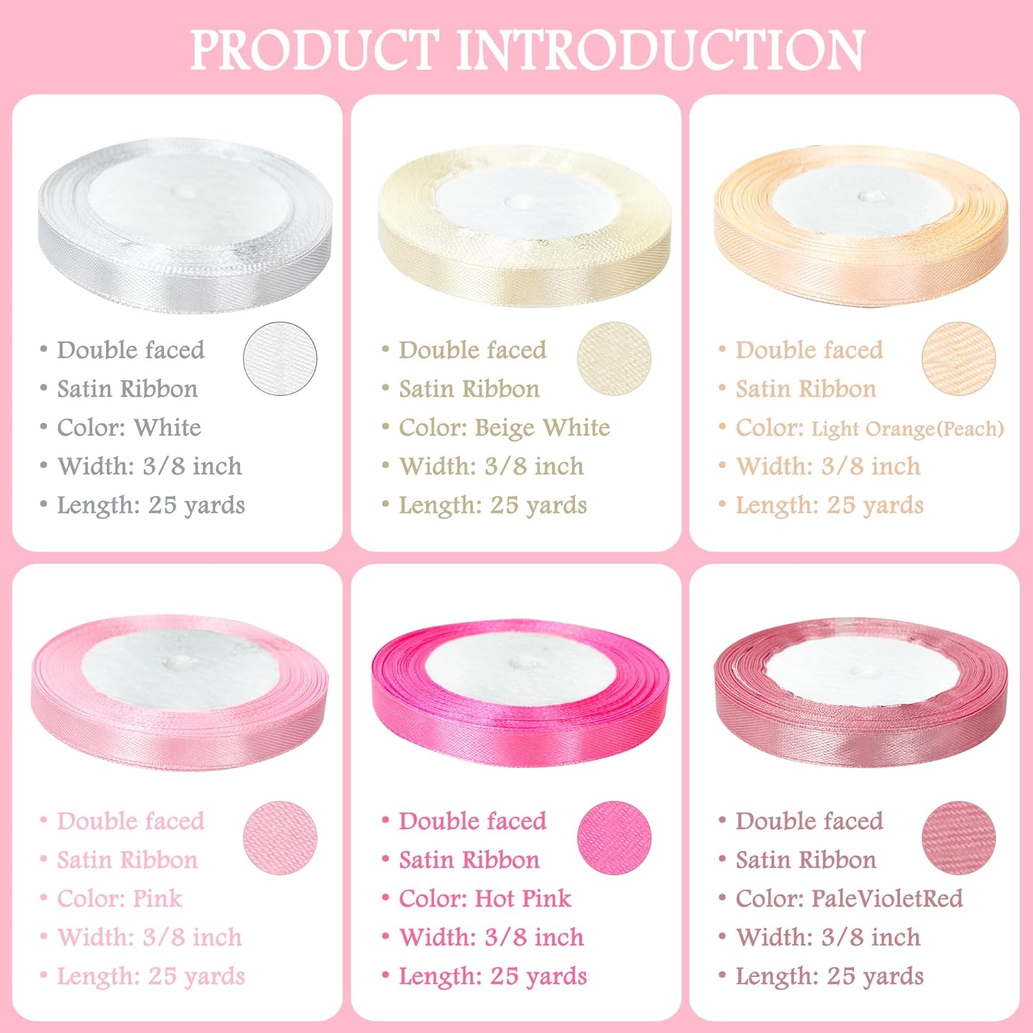 - Sizes: You will get 6 different colors satin ribbons. Each roll is 25 yards in length and 3/8" in width.