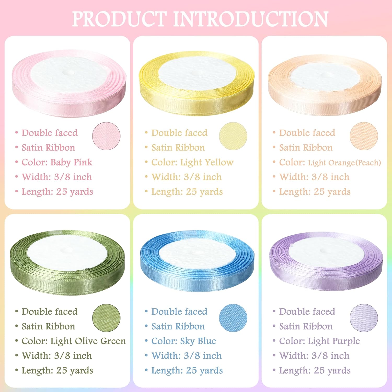 - Sizes: You will get 6 different colors satin ribbons. Each roll is 25 yards in length and 3/8" in width.