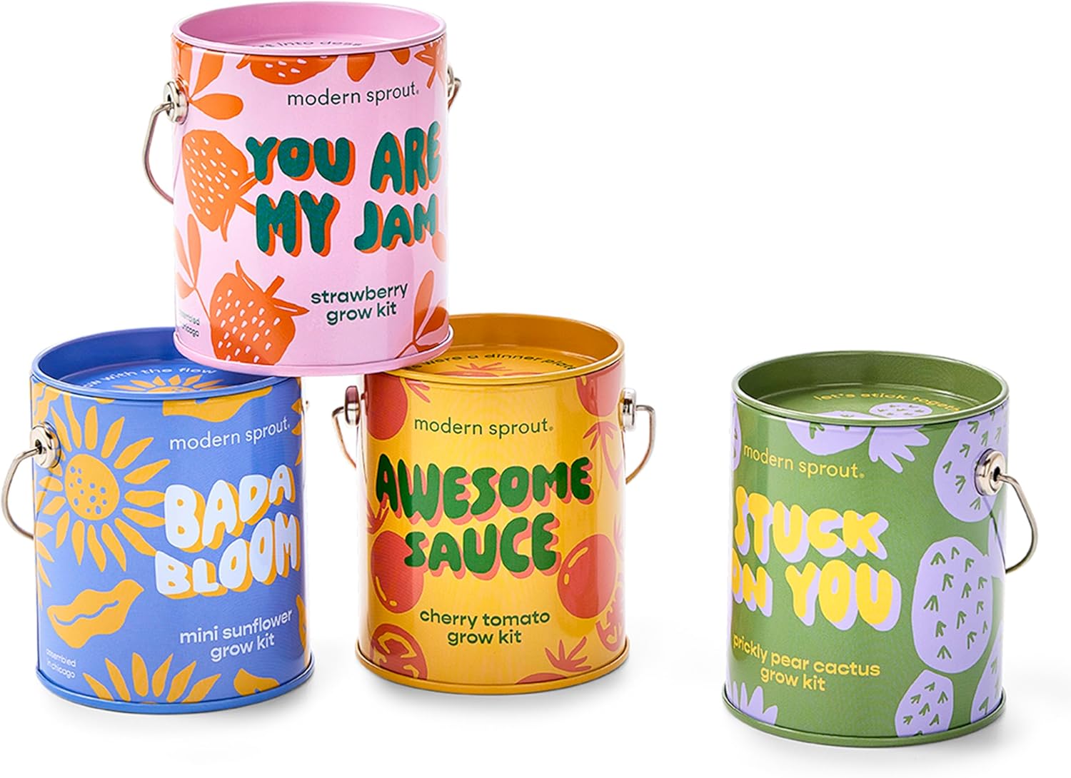- Package Contents: Modern Sprout Complimentary Color Grow Kits Pack of 4 - Includes organic strawberry, cherry tomato, mini sunflower and pricky pear cactus seeds with expandable growing medium & simple instructions on the back of can