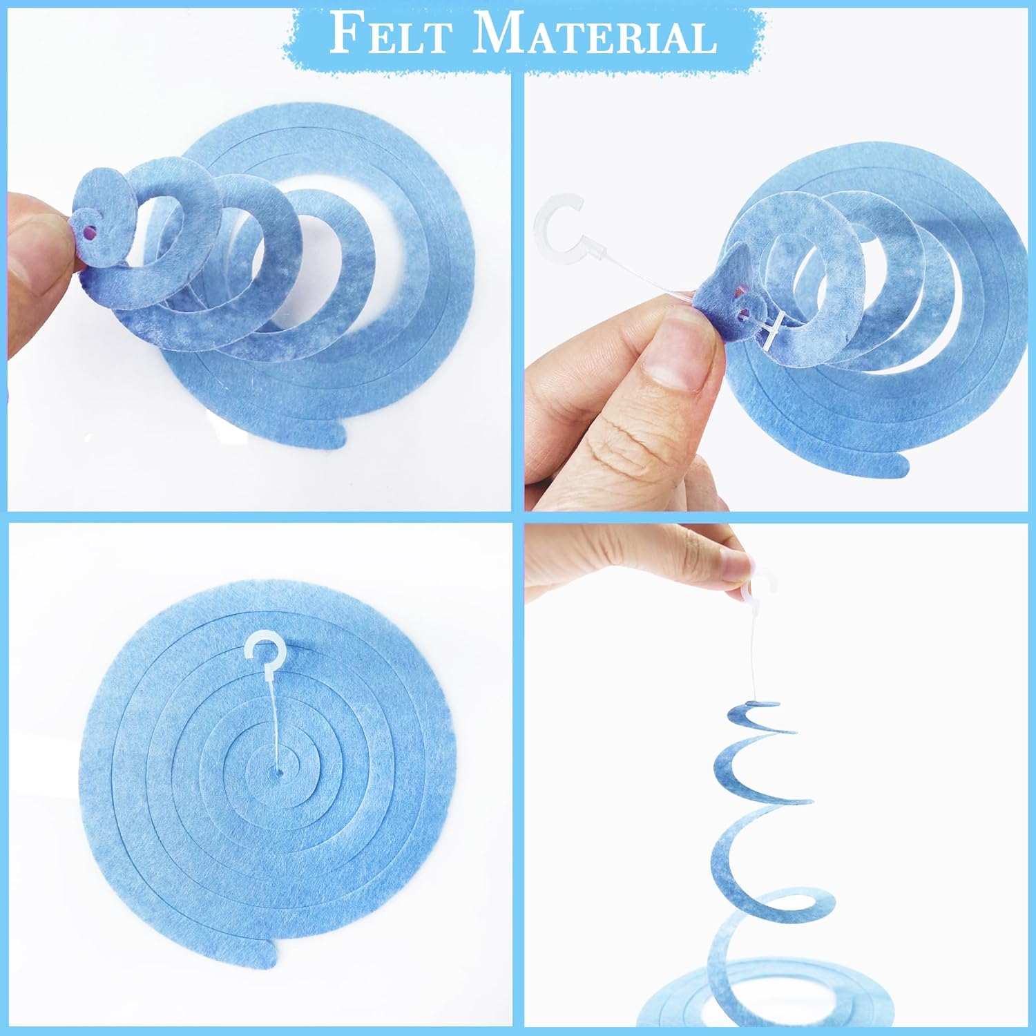 - High-Quality - Our felt swirl hanging decorations kit are made of high-quality felt in gray blue color(navy blue,sky blue,dark gray,light gray),Soft texture and safer than PVC swirls.durable and reusable.and the color is more pastel than general PVC whirls.