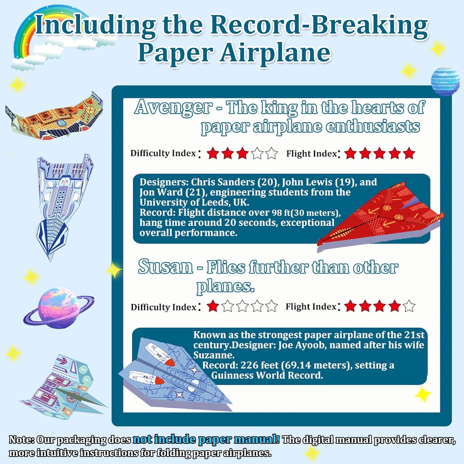 - High-Quality Paper and Durable Design: Our paper airplanes is made from premium, durable paper with vibrant colors, allowing your child to fold amazing high-flying planes. Featuring 16 classic designs and record-breaking models, it's perfect for kids ages 6-12 to explore their creativity.